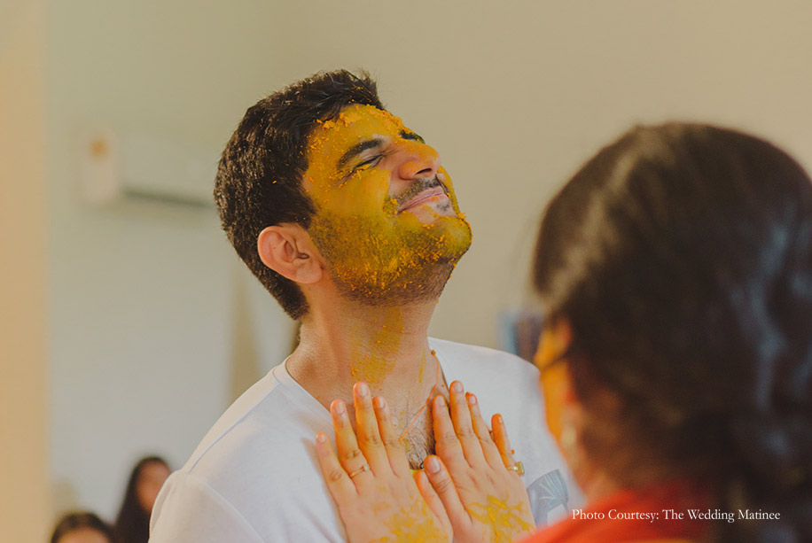 “When it came to our outfits, Yatin and I chose to keep it simple to reflect our personalities. For the haldi and cocktail events, I designed my own outfits by sourcing the fabrics locally and getting it stitched at my local boutique in Noida. Yatin’s attire was also designed by me wherein I picked out the fabric, had it assembled, and then added an Anita Dongra dupatta to it as a final flourish.”
