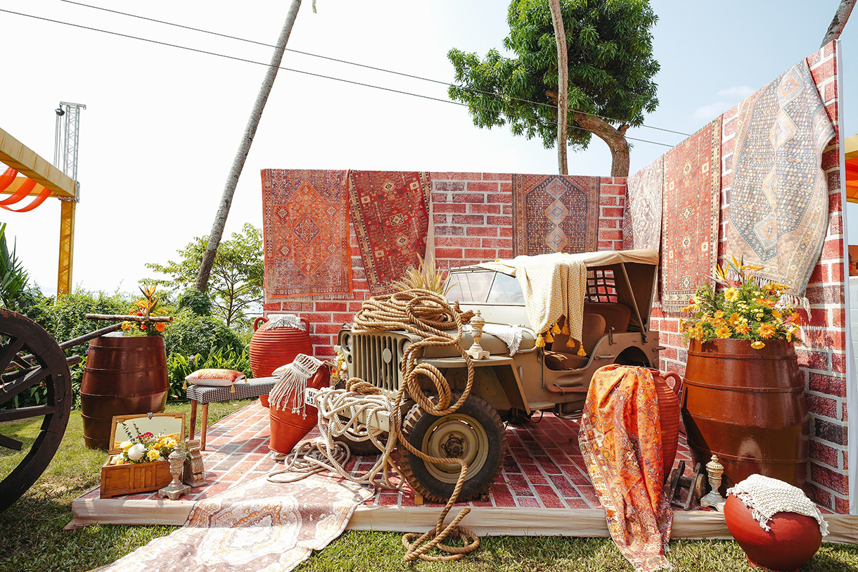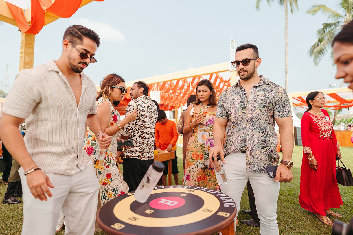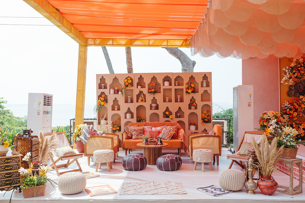 Set against the golden hues of a Goan sunset, Isha and Divyam’s sundowner was a soulful blend of boho charm and curated elegance. Designed with layered textures and earthy tones, the space featured eclectic lounge setups with cane chairs framed by a custom jharokha-inspired backdrop dressed in marigolds. Above, striking swirls of rust and saffron fabric added a dramatic flourish to the ceiling, casting a warm glow across the open-air celebration. With live music setting the mood and curated cocktail bars elevating the experience, this soirée felt like a Mediterranean dream with an Indian heart.