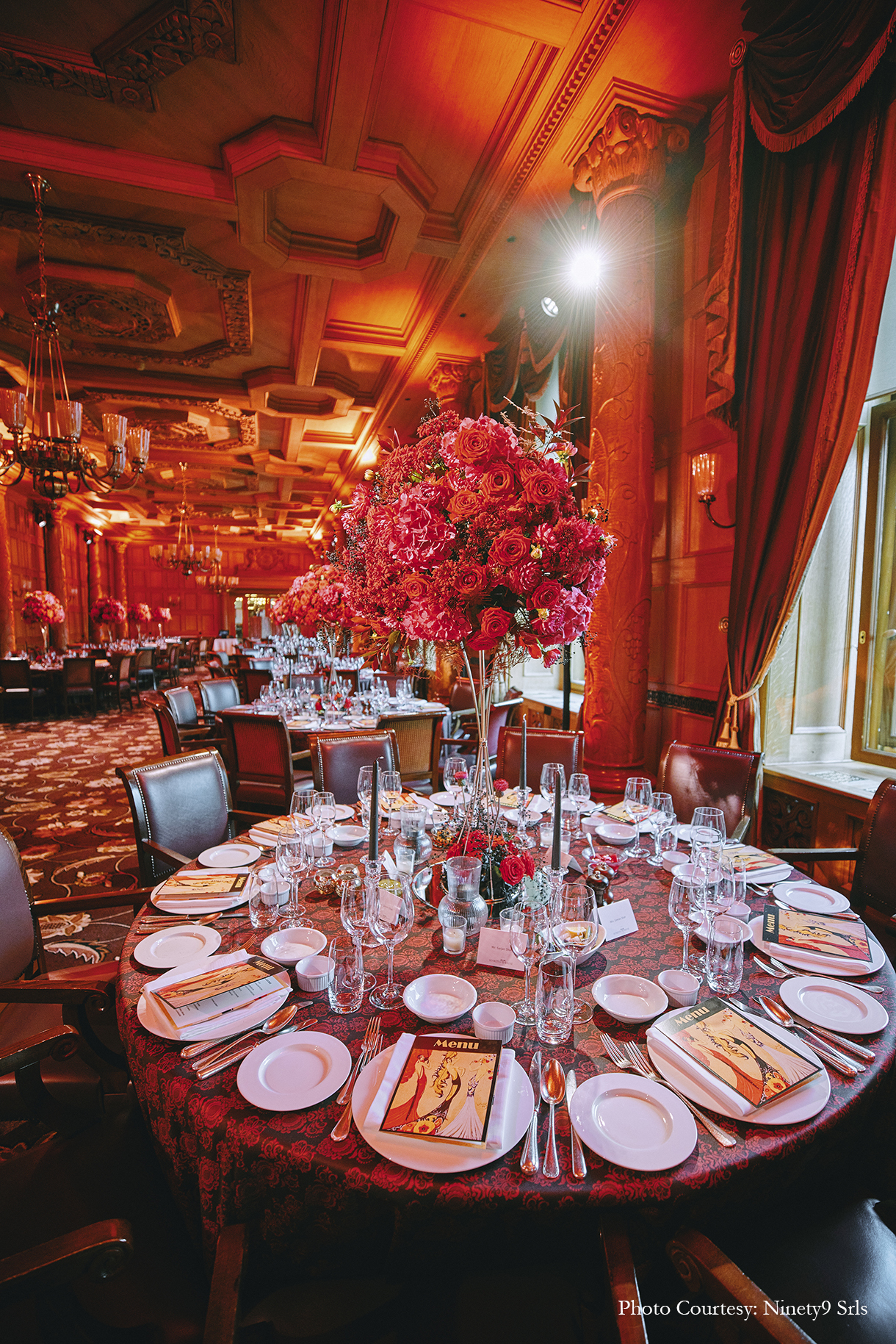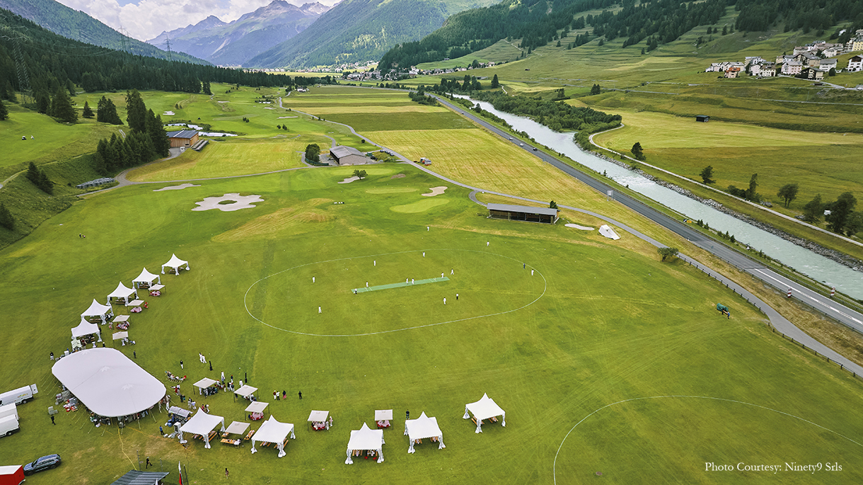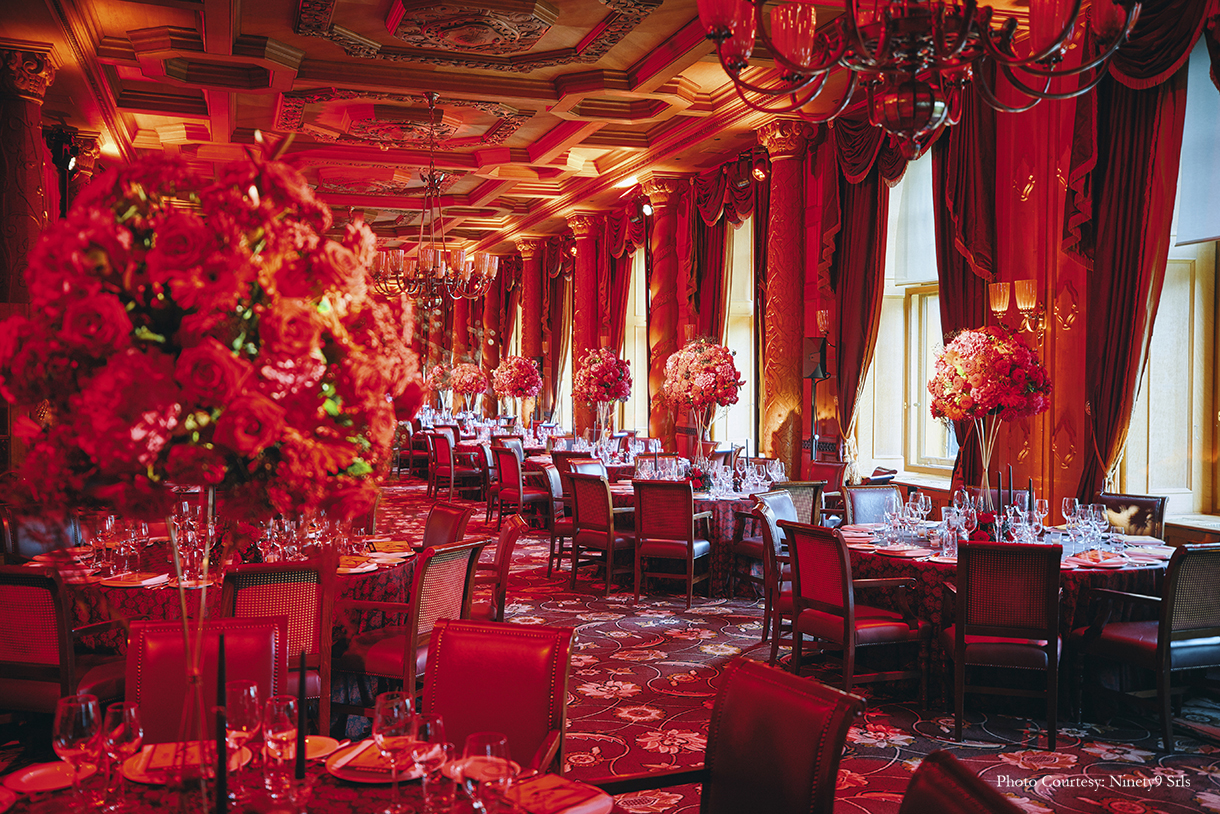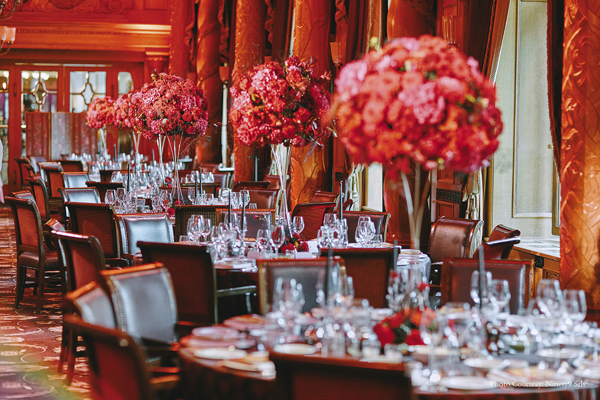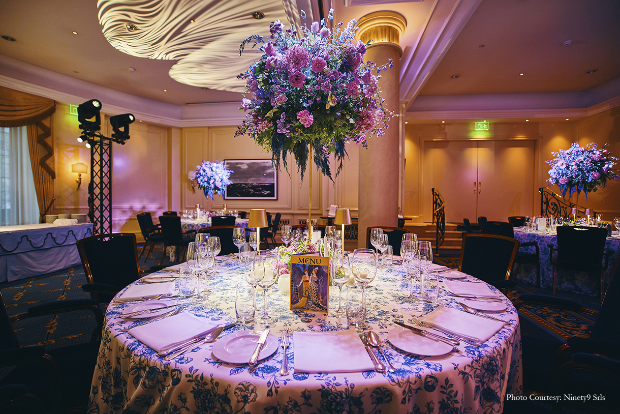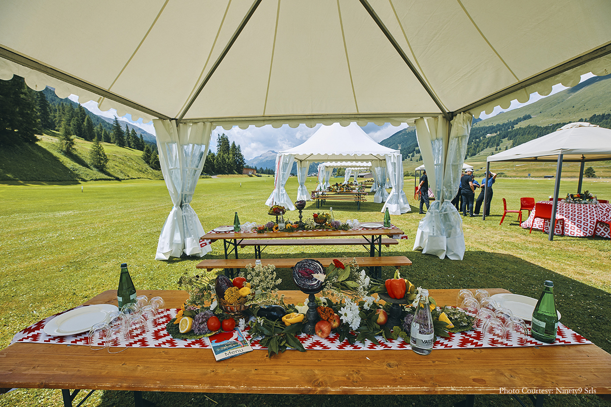 The first day kicked off with a cricket game – a favorite sport for Indians all over the world. And, what’s better than a cricket game with a majestic view of the Alps? Bhavnesh shares, “The cricket game was hosted on the Zouz Grounds which was a fantastic location. With white canopies and long wooden tables for the players to refresh themselves after the game, the setup was fuss-free with simple floral arrangements as centerpieces on the table.” After the rigors of the day, the guests were treated to a magical Grand Ball. Farid shares, “The guests were directed to the extravagant Suvretta Grand Ballroom where an incredible world was unexpectedly revealed. As guests interacted and savored the opulent setting and the magnificent performance by Fire and Ice, the floral displays and exquisite table settings, fostered an atmosphere of celebration.”