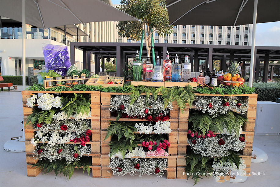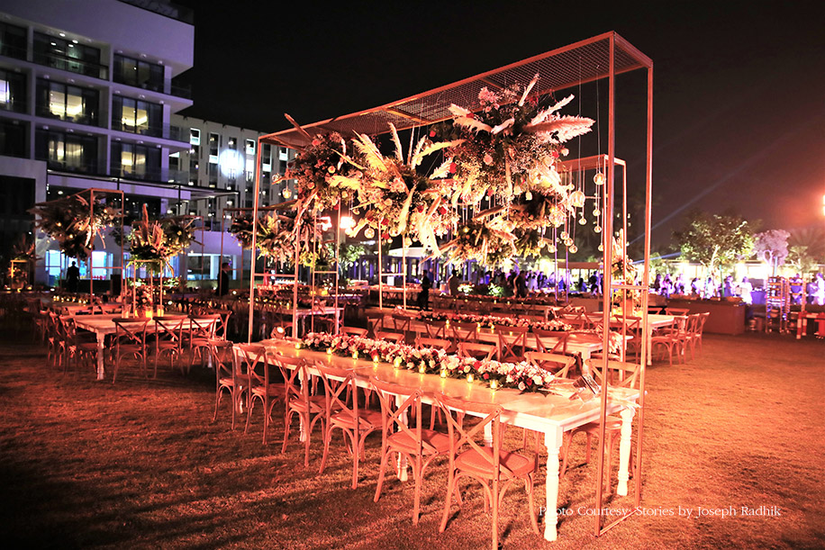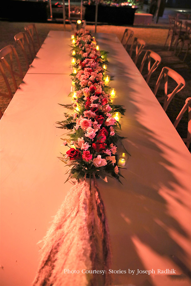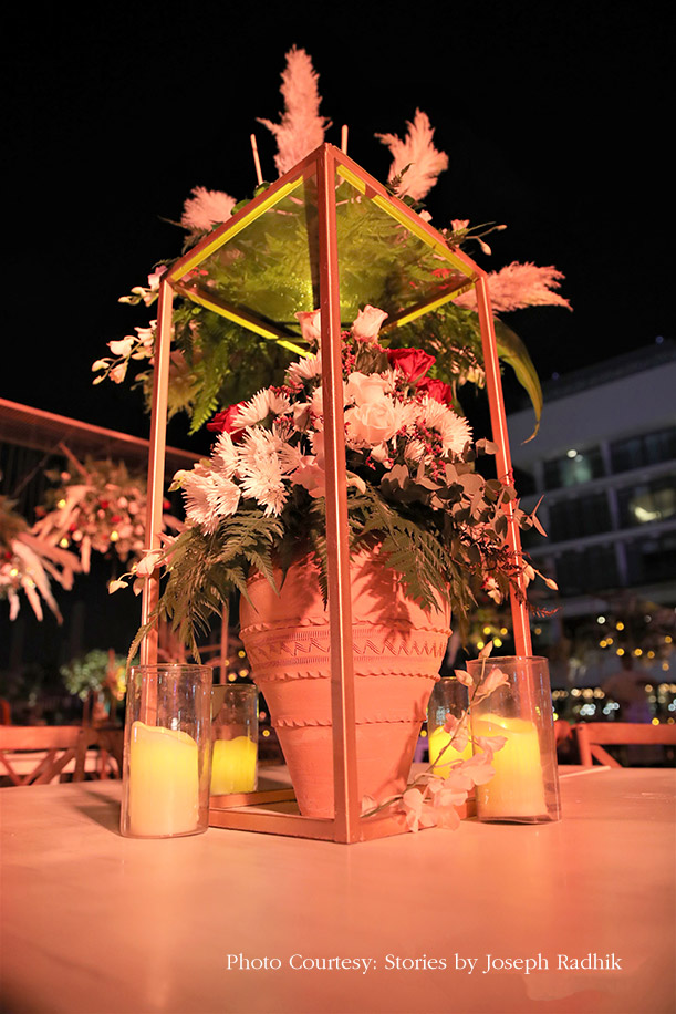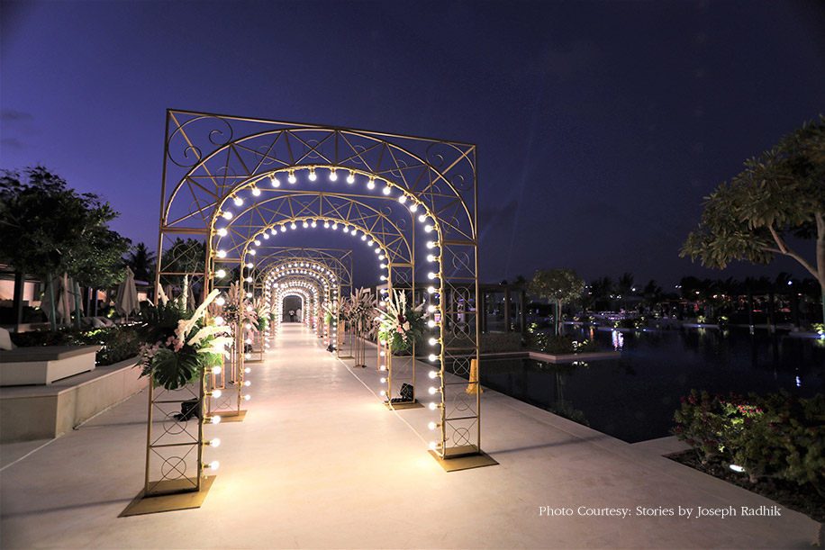 Guests had to walk through an elegant bulb archway to reach the sundowner mehndi venue. The contemporary furniture and white decor elements were placed on Arabic carpets, thereby creating an open seating area with a mesmerizing view of the sea. Sleek, metallic structures juxtaposed with pretty compositions of flowers, foliage and pampas grass lent a dreamy ambience to the area and dining tables. The evening included fun and a live band to entertain the guests.