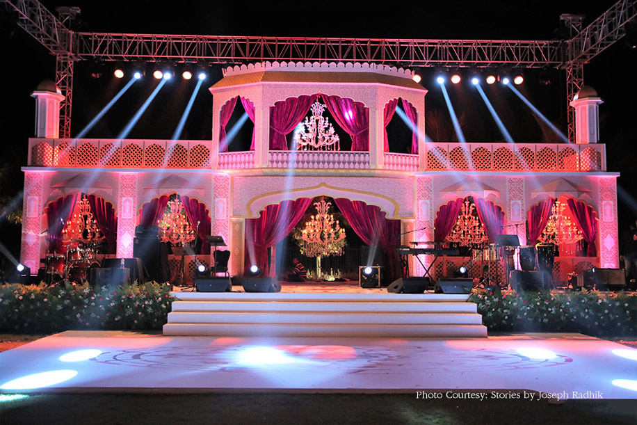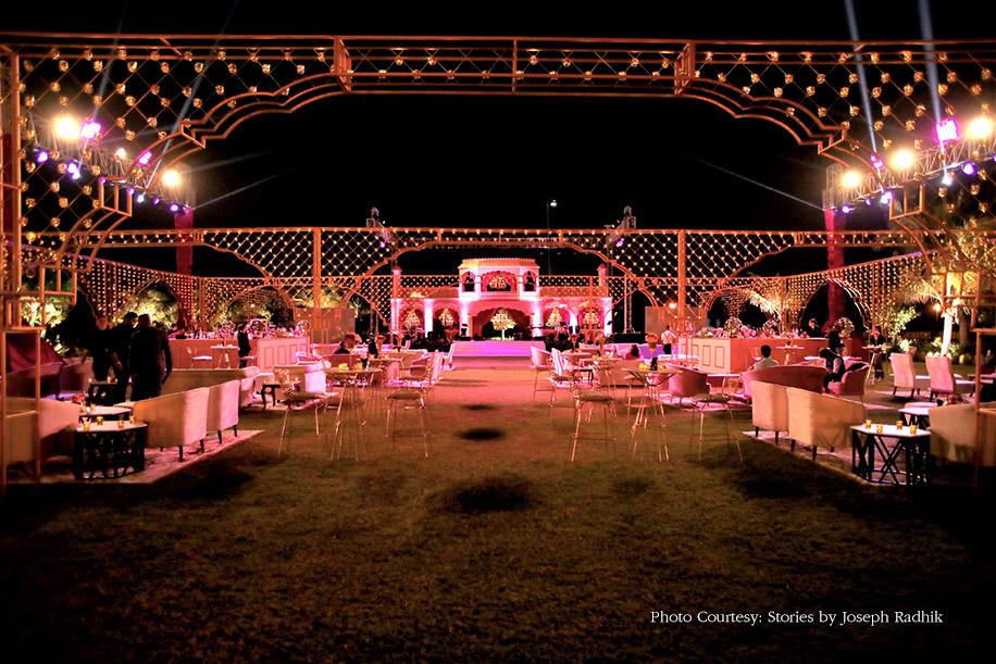 Hosted on the rolling lawns, the sangeet emulated the look and feel of a royal Jaipur palace courtyard. Plush white and pink couches placed on Iranian carpets dotted the event. The venue was bathed in the warm glow of 5000 T-lights, and the palatial backdrop exuded grandeur which was further enhanced thanks to the presence of chandeliers and pink velvet drapes.