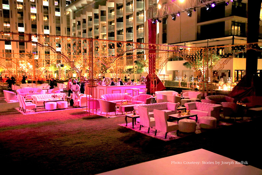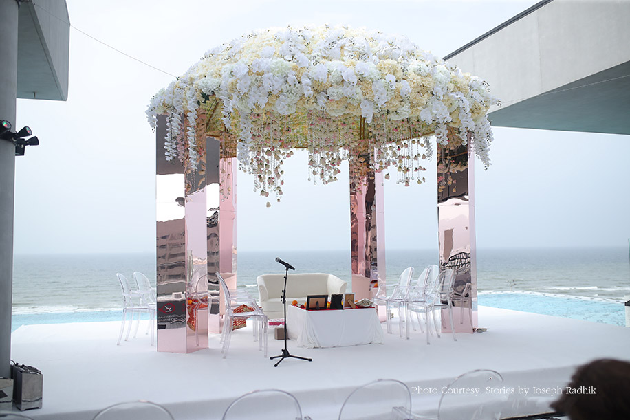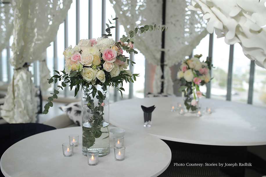 The joyous baraat processions started with pomp and splendor at the driveway of the hotel, and led to the wedding ceremony at the roof-top lounge. The sophisticated decor palette of white and pink hues paired well with the minimalistic designs, gorgeous floral installations and vases of roses, baby’s breath blooms and trailing leaves. The highlight of the event was the domed mandap made entirely of white blooms. It was erected on mirrored pillars and decorated with flowers and crystals suspended from the canopy. Elegant, transparent chairs for guests added a touch of finesse to the overall ambiance.