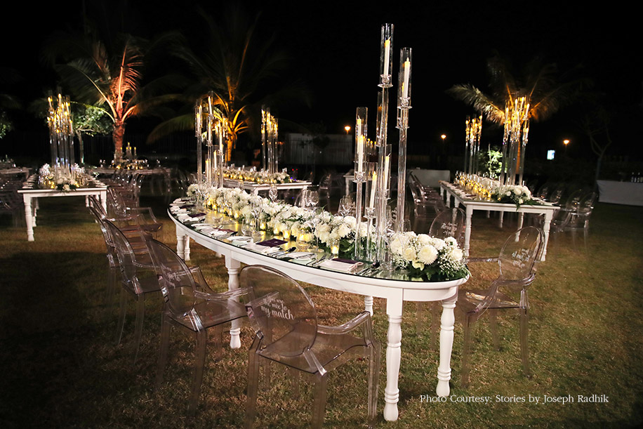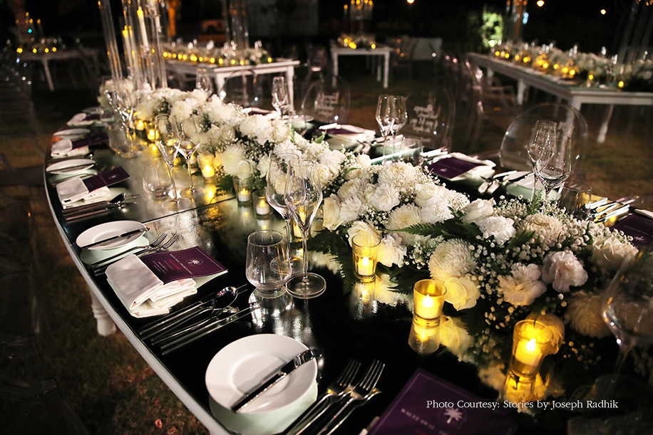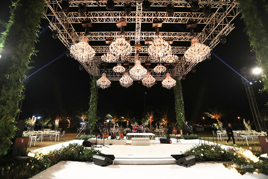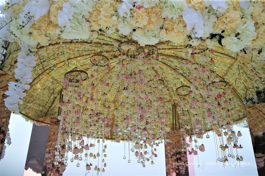 The reception decor blended innovation and technology with opulent designs. The evening saw a magnificent triple-layered stage setup, lined with green columns of foliage. The open-air dining setup was an elegant composition of white with floral arrangements and long candles. The transparent chairs were emblazoned with iconic love quotes from movies. The focal point, however, was the mechanized setup of crystal chandeliers that moved up and down through the night for a magical effect. When the couple entered, the chandeliers descended around them, creating a shimmering cloud that engulfed them as they danced, and that vision drew a collective “Wow!” from everyone.