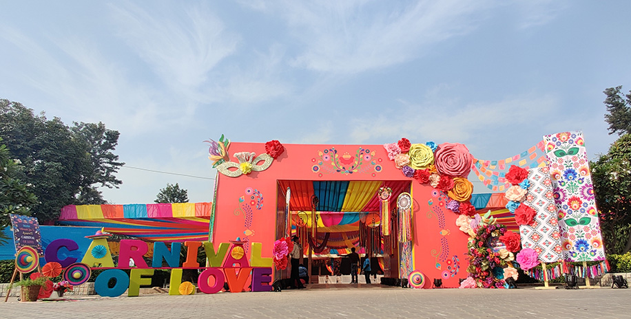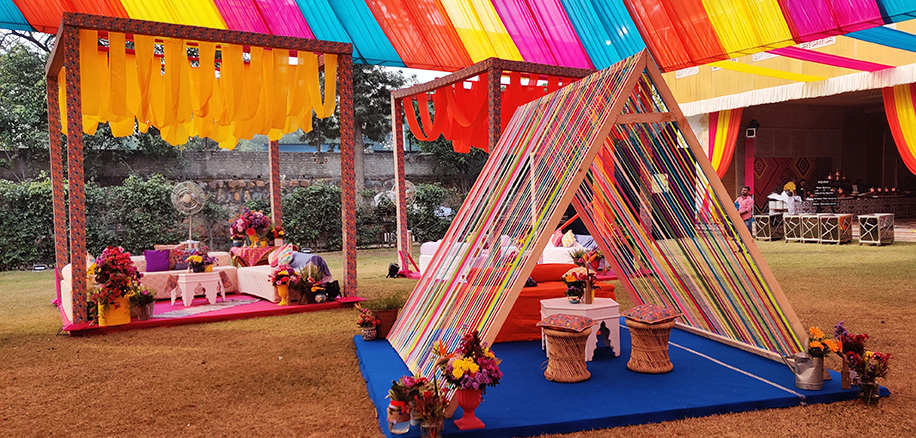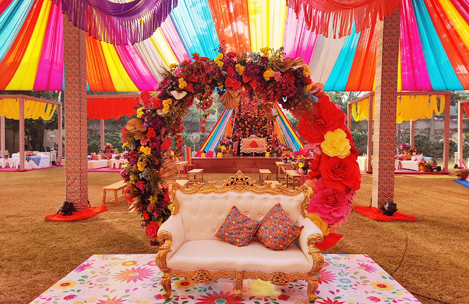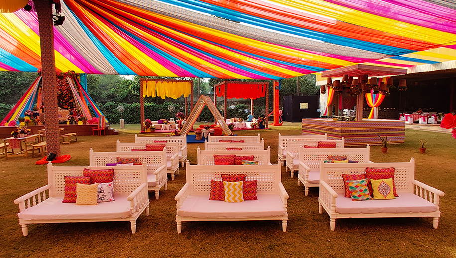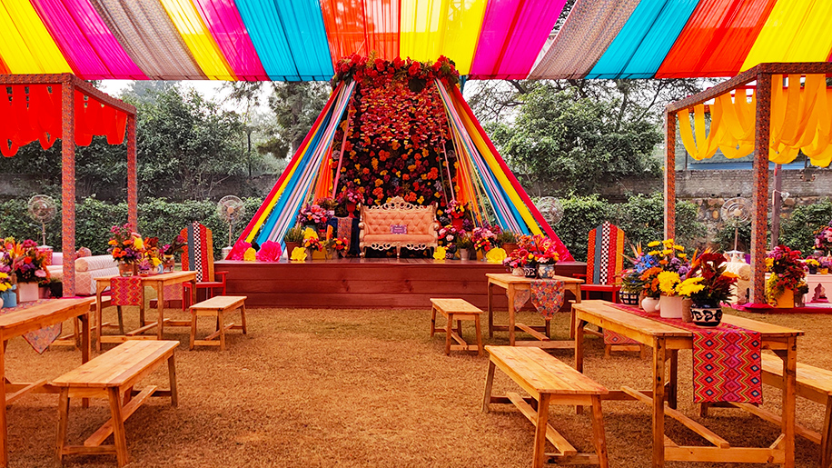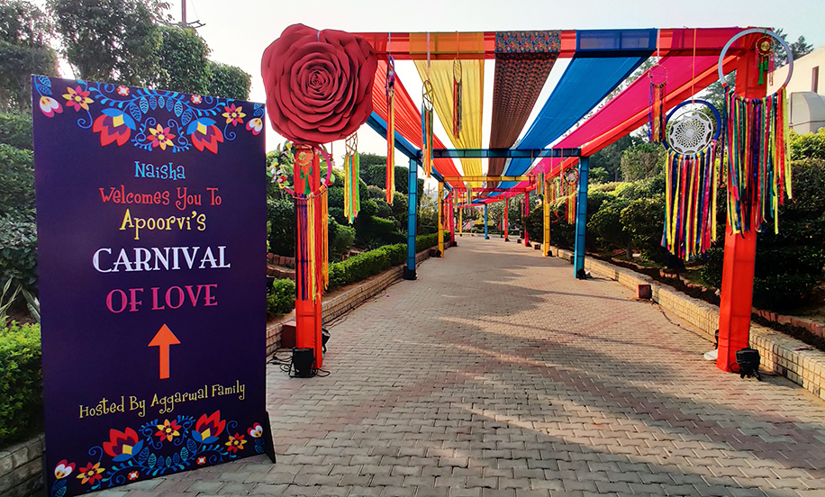 The vibrant mehndi function with a ‘Carnival of Love’ theme was held at the sprawling Jhankar Garden, where a quirky signboard beckoned guests into the maze of color. Hues of citrus, blues and pinks collided and diverged in kaleidoscopic formations thanks to floral decorations, drapes and props. Multicolored teepees furnished with low, reclining seating added a bohemian touch thanks to colorful cushions in traditional prints. Bare wooden benches and tables added to the rustic-chic vibe of the affair. Guests were particularly drawn to a spectacularly decorated swing setup, as well as an area set up with fun games.