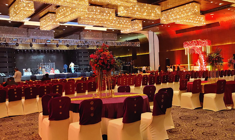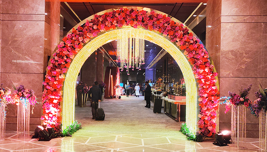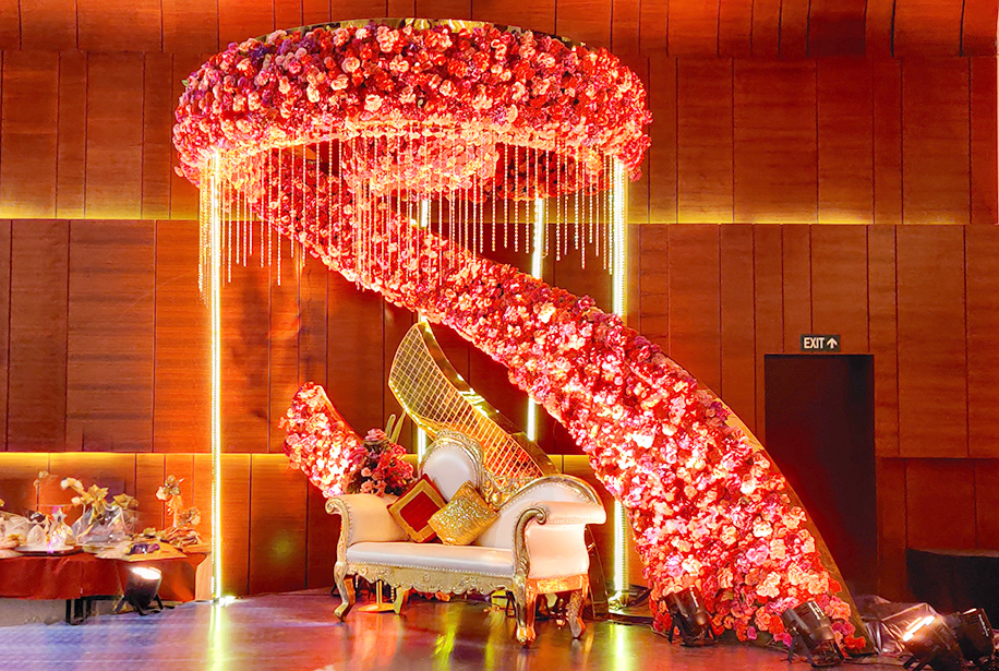 The sangeet ceremony was held at JW Marriott Hotel New Delhi Aerocity, and guests were greeted with the sight of a stunning arch comprising red blooms the minute they entered. Sleek structures in eclectic shapes along with a profusion of crystals and exotic flowers created a magical ambiance, while the neon multicolored stage and dance floor transported one back to the disco era of the 1970s. The highlight was a grand structure of flowers that rose upwards and towered above the bridal seating area.