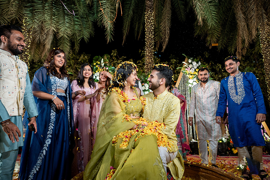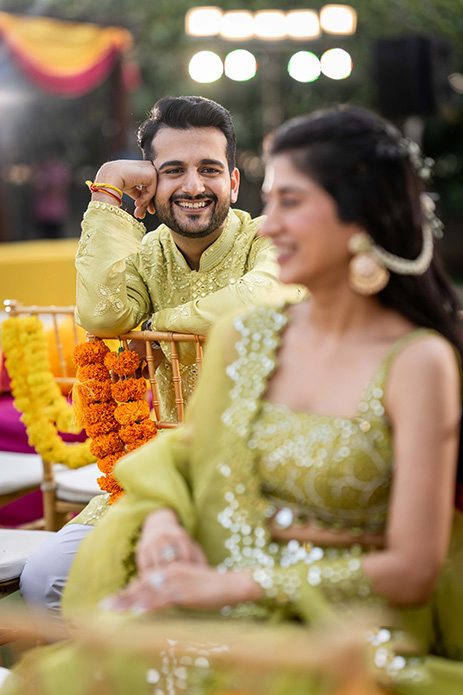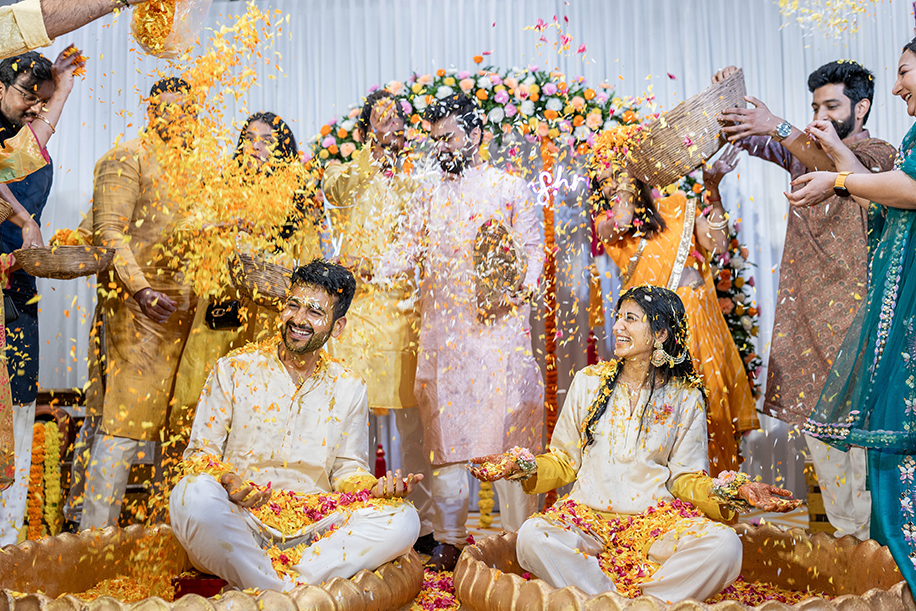 The Haldi ceremony was hosted with a simple yet stunning backdrop of flowers that framed the couple. Sitting in large urli pots, the couple was all smiles as their loved ones showered them with flowers.