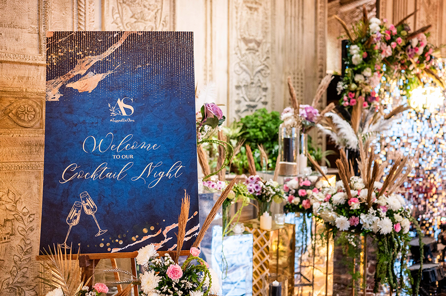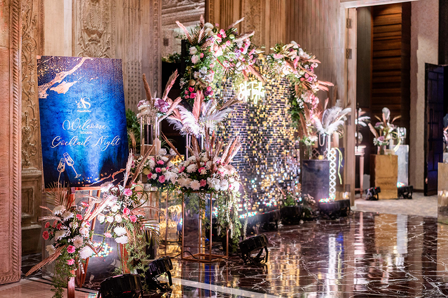 The Cocktail evening was glamor galore! Greeted by a scintillating floral and neon setup, the guests enjoyed an evening of delicious cocktails and rousing music to celebrate the happy couple.