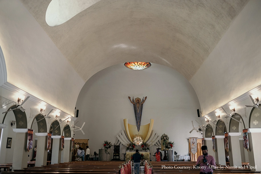 The couple tied the knot with intimate festivities full of warm, family moments starting with a traditional Church ceremony. The elegant occasion was decked with a minimal decor of white and red flowers that delicately enhanced the serenity of the venue. The bride walked down the aisle with bridesmaids and flower girls dressed in red matching the decor. The couple exchanged vows as their families looked on.