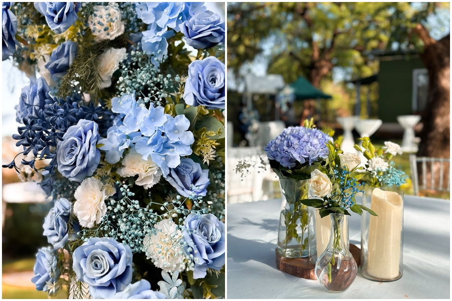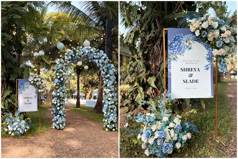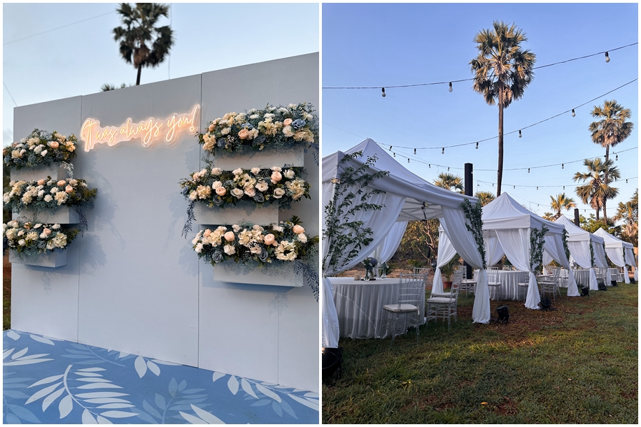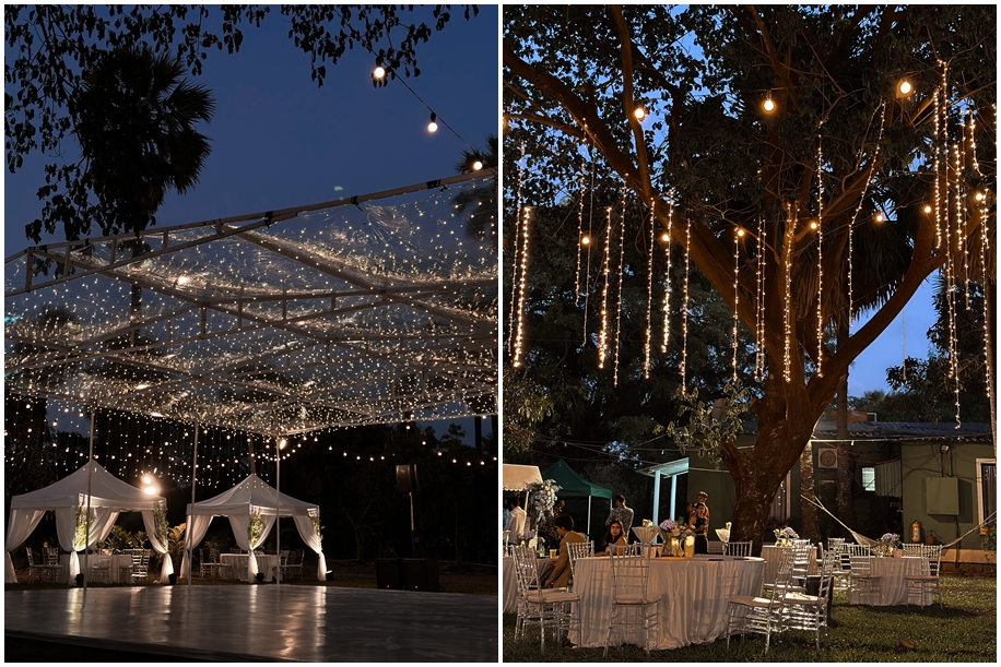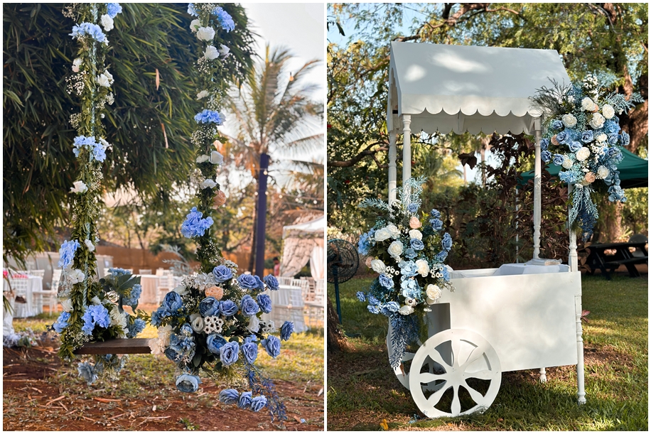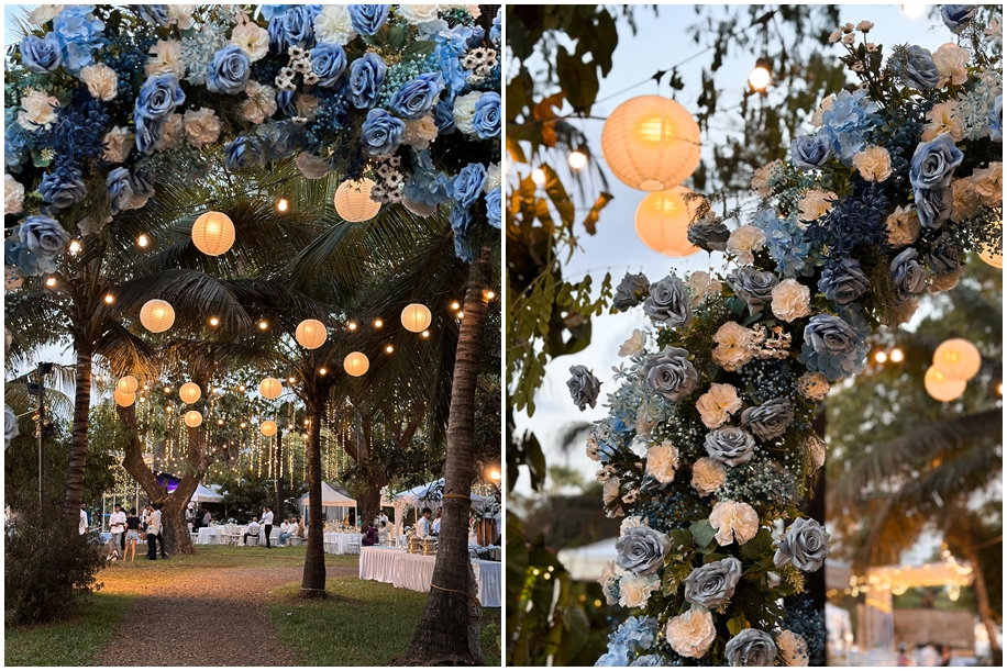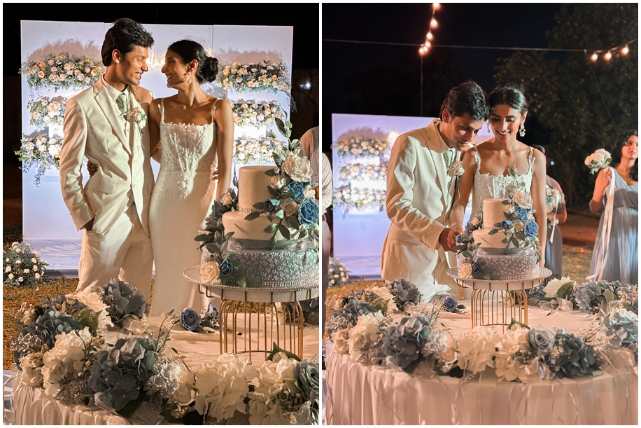 The sundowner soiree was imagined in a dreamy palette of dusty blue, with gorgeous floral arrangements adorning everything from the entrance arch to photo corners, tabletops, and even the breathtaking multi-tier cake. The soft summer palette transitioned beautifully from day to night as warm lights in the form of rice lanterns and fairy lights bathed the space in their glow. The blue floral-patterned dance floor was covered with a canopy of fairy lights so everyone could ‘dance under the stars’. A layer of clear sheets offered protection from the rain, while also reflecting the lights thereby doubling the beauty of the occasion. The couple shone radiant with happiness as they cut the cake and danced the night away with their loved ones.