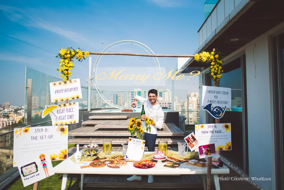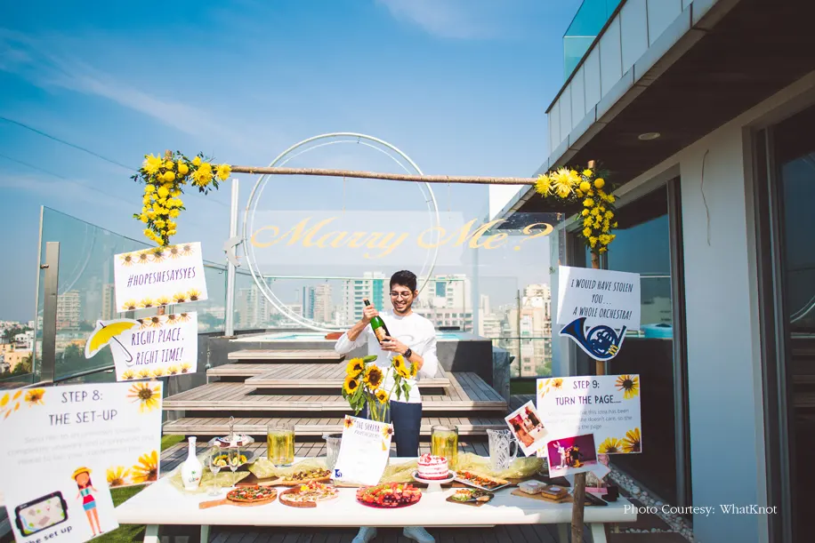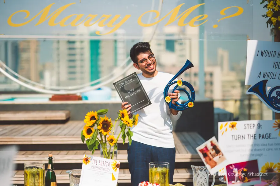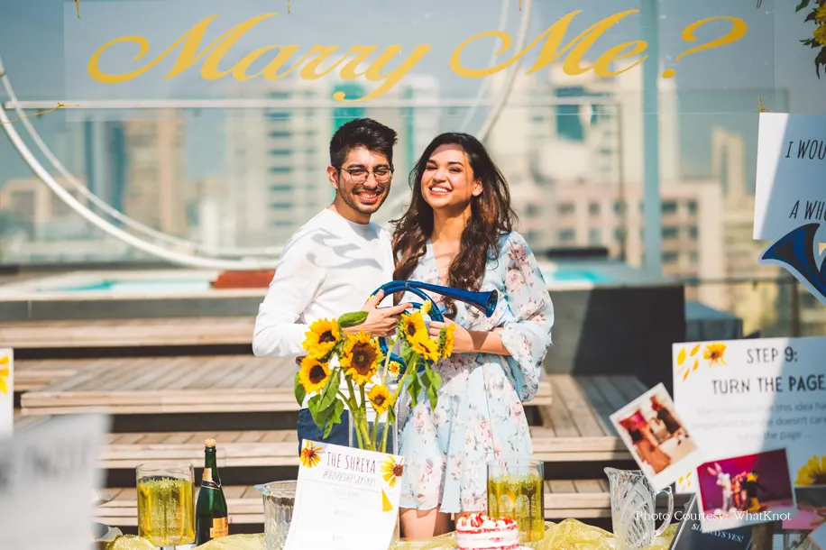 When it came to planning the perfect proposal Sayam left no stone unturned to impress Shreya. Hosted on a sunlit rooftop with the clear blue sky bearing witness, he indulged her with mouthwatering desserts and a bottle of sparkling champagne. Surrounded by nostalgic memories, adorable love notes along with a huge banner with ‘Marry Me?’ written on it, the proposal was a feast for the eyes. Later the happy duo celebrated the momentous occasion by popping a bottle of champagne. However, the cherry on top was when Sayam gifted Shreya a miniature blue french horn that took them back to the moment they first realized their love for each other. Shreya shares, “Five years have passed since that fateful night and both of us have grown so much as individuals. And even though we’ve juggled a long-distance relationship for three years, the bond between us has remained unbreakable. We’re both opposites but somehow, we work well together. Everything in the proposal was absolutely stunning and I can’t wait to start this new adventure with him.”
