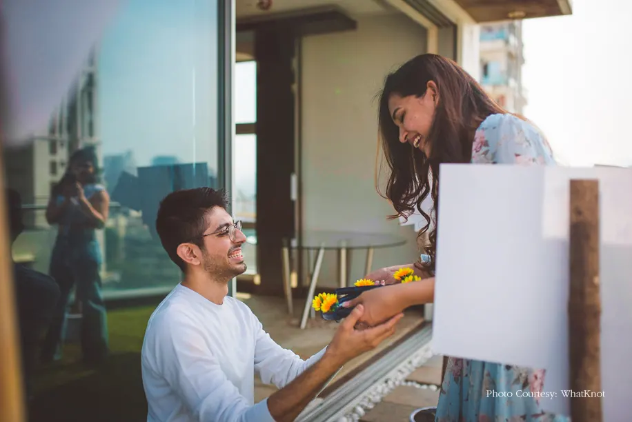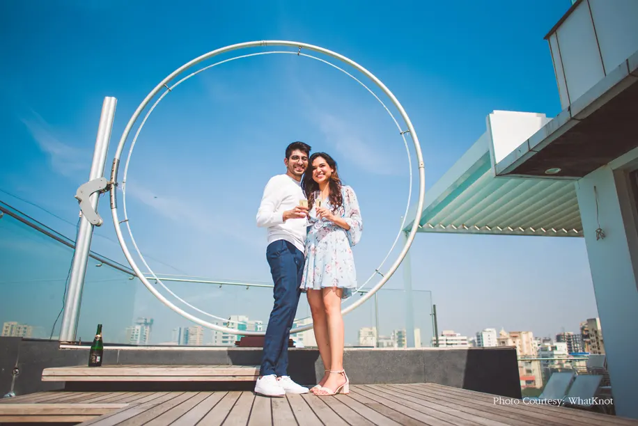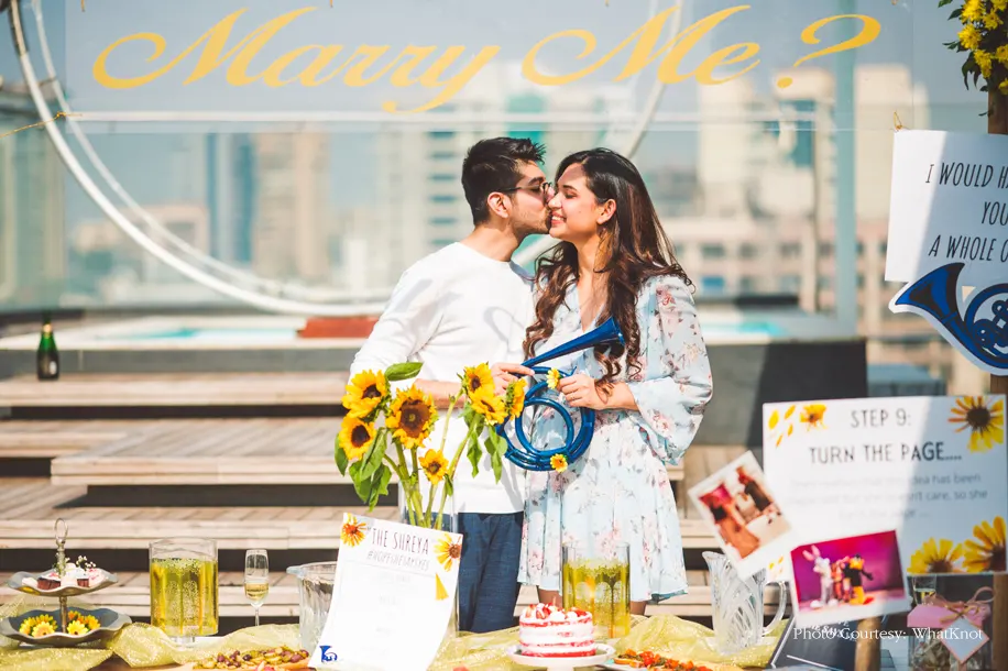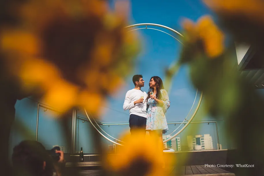 Shreya Dwivedi and Sayam Arora knew from their first midnight walk itself that the chemistry between them was too potent to ignore. And, to make sure that his to-be bride was swept off her feet as he popped the question five years later, Sayam orchestrated a rooftop proposal that sent the cuteness levels soaring with its thoughtfulness. WeddingSutra Favorite – WhatKnot captured lovely photos of the surprise proposal.