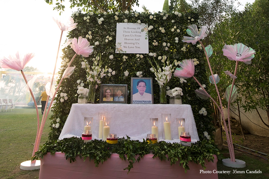 The highlight however, was the special setup made by the planners for the bride that paid a heartwarming tribute to her late parents and other family members who had passed away, so she could feel their presence on this day. With a stunning backdrop of flowers and foliage, the setup was further decked up with candles and other props for a serene effect filling the joyous evening with warm emotions. The evening was filled with music, dance and non-stop merriment.