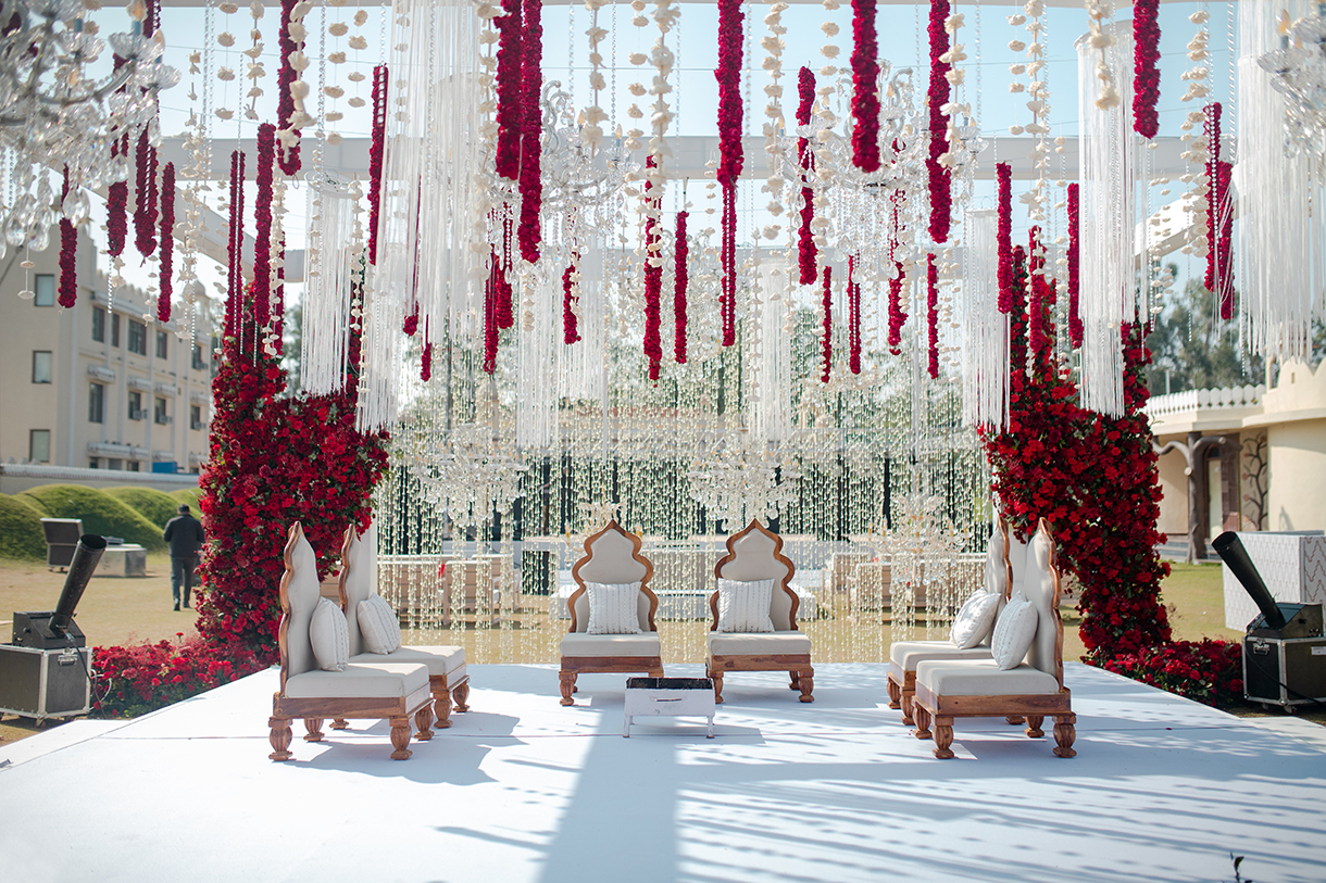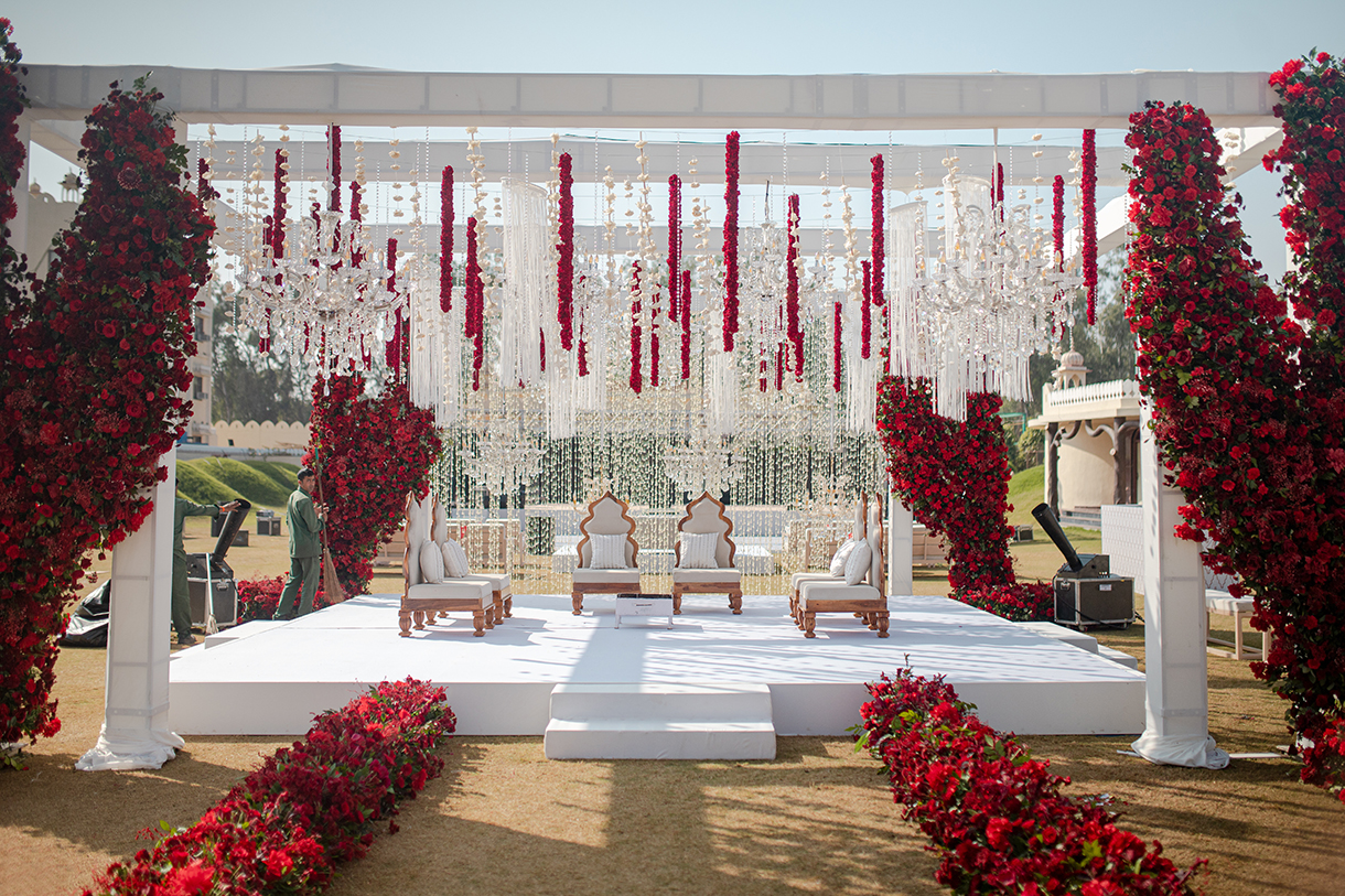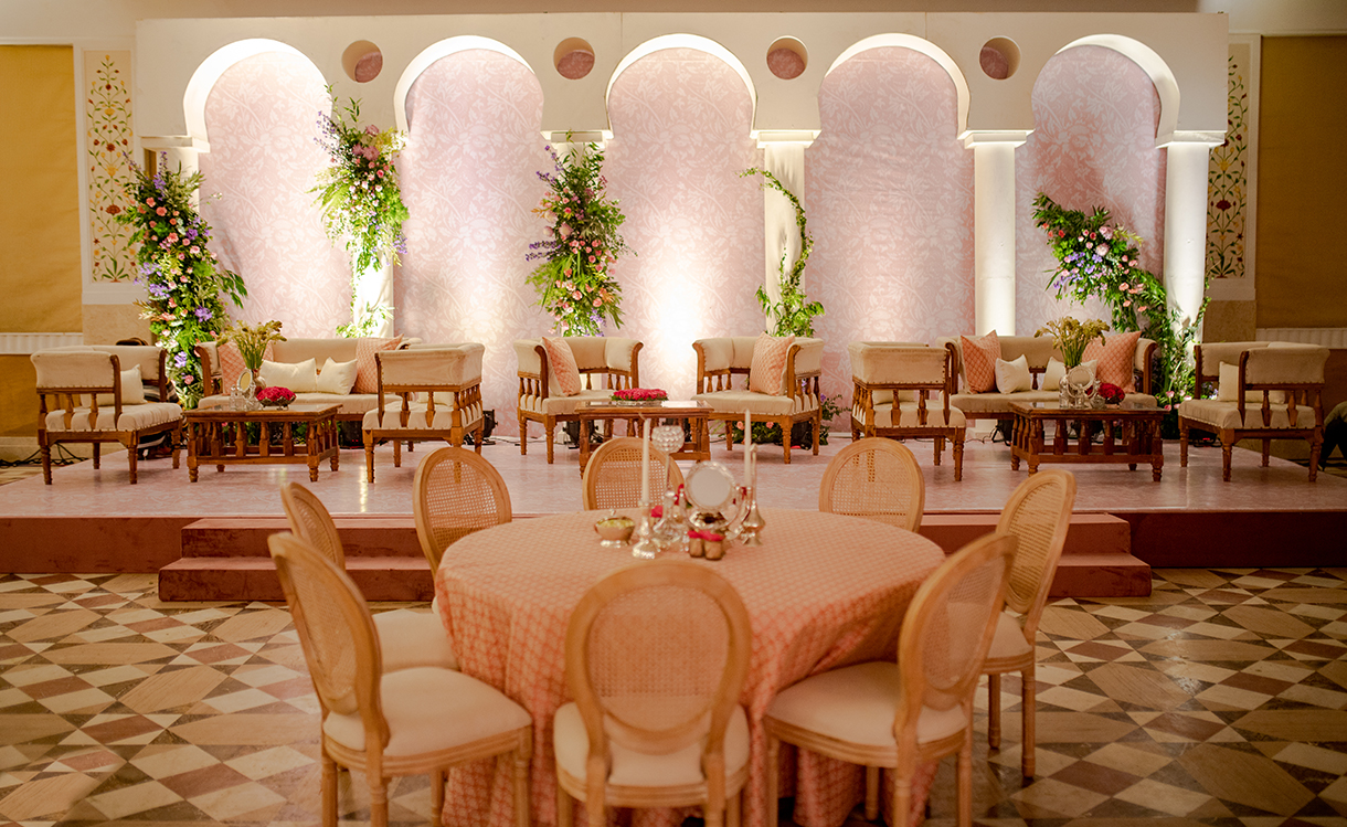 For their dream destination wedding at Le Méridien Jaipur Resort & Spa, the couple turned to the team of Nazara to design and execute the decor for each function. From incorporating personal touches like their favorite flowers to designing themes to match their vision, the team was dedicated to going the extra mile to ensure the celebration was unforgettable.