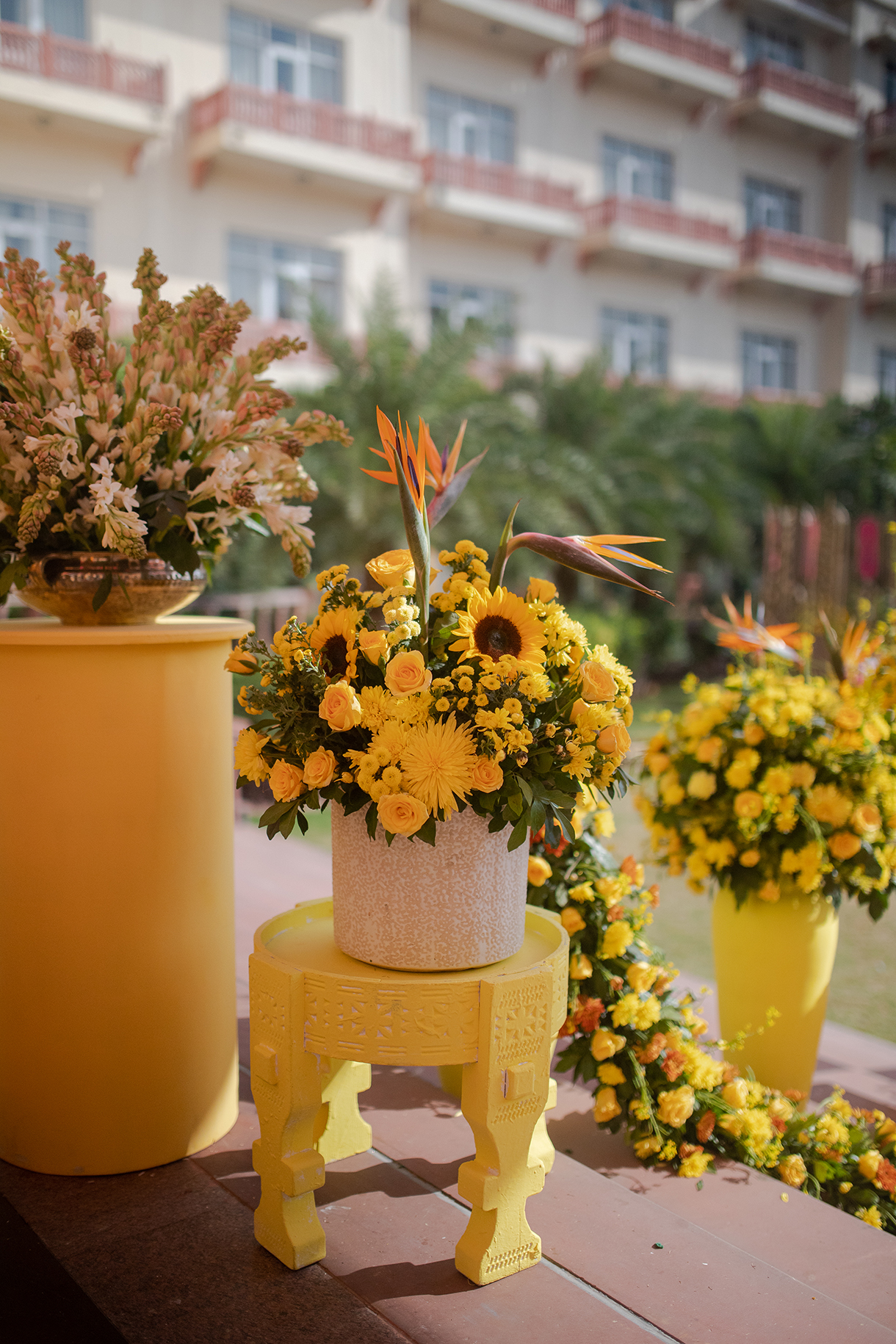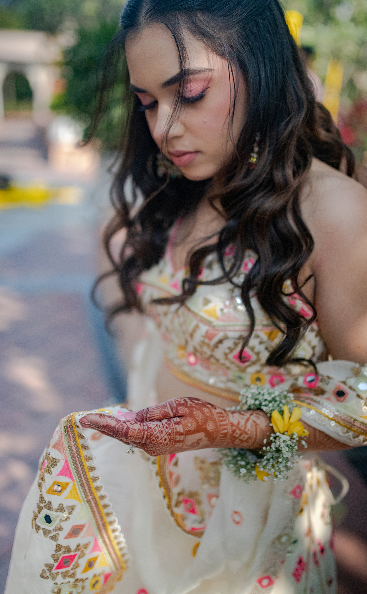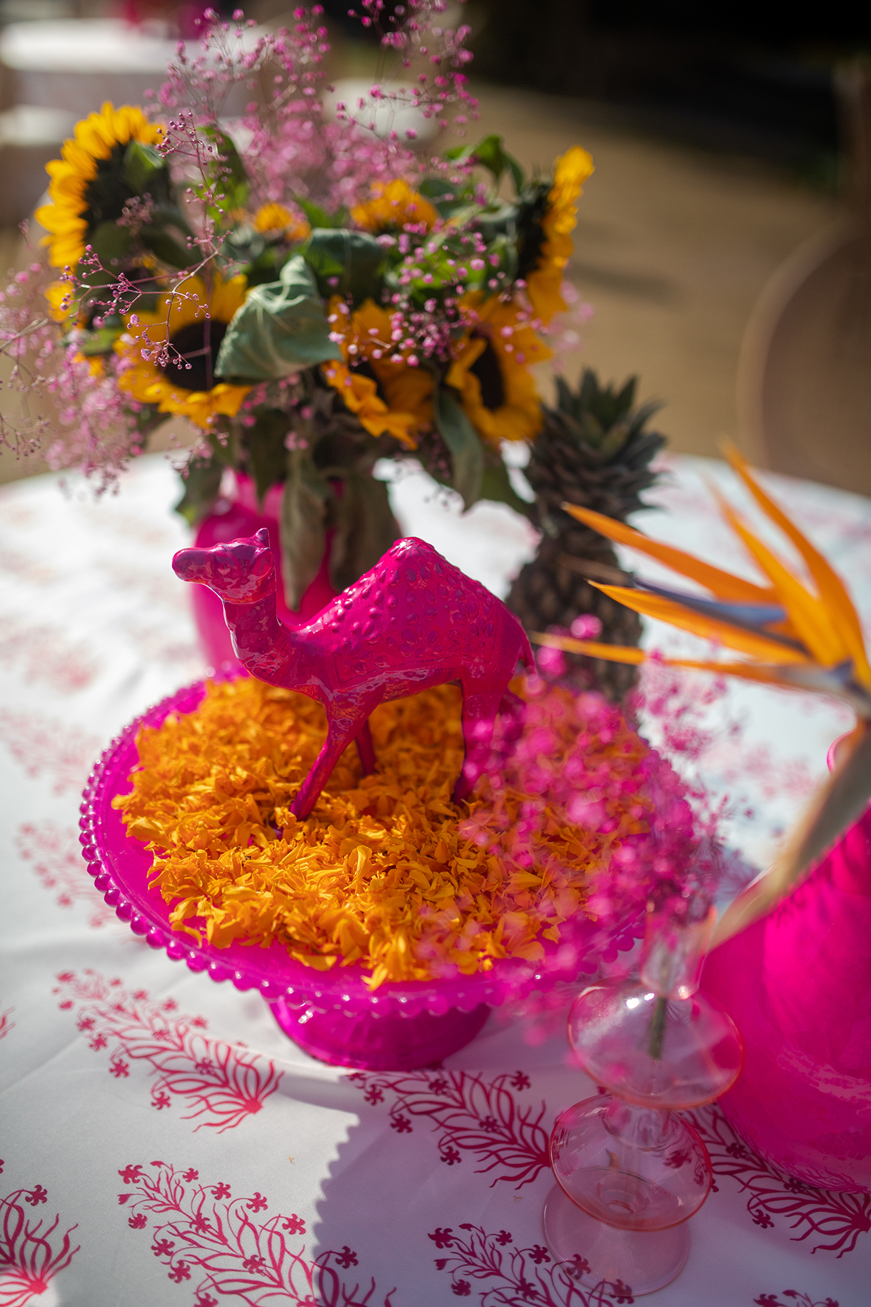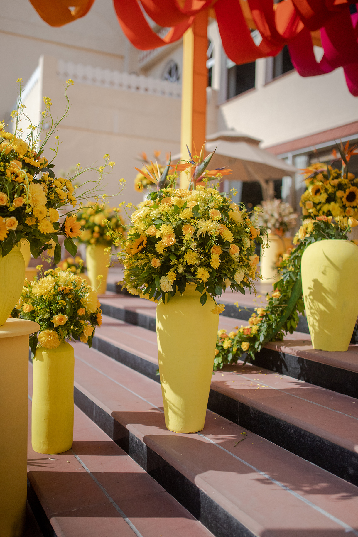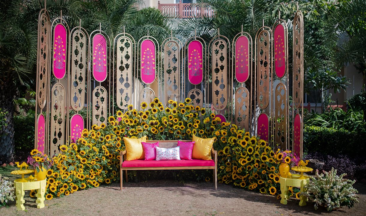 Transforming tradition into a modern marvel, the Haldi was imagined with decor that drew inspiration from the vibrant culture of Rajasthan, infusing it with a contemporary twist. From traditional booties to a captivating stage backdrop enriched with local flavors, every detail was imbibed with Rajasthani charm, including the camels in the floral centerpieces that added a playful touch. The highlight was the abundance of sunflowers, which captured the bride’s love of the flower, and the groom’s adorable ritual of gifting her one every time they met.