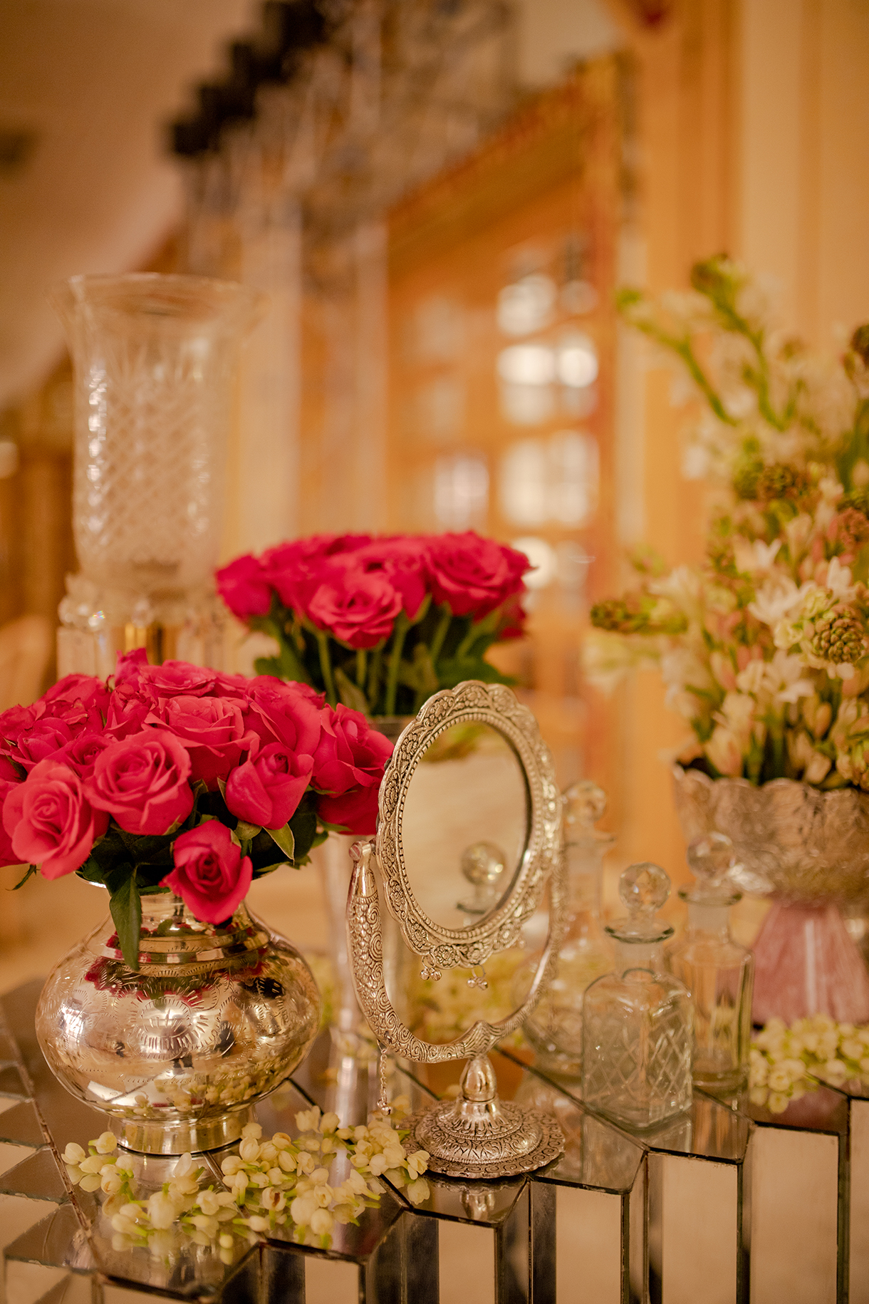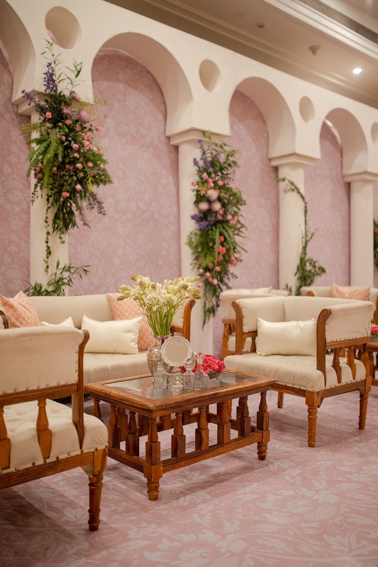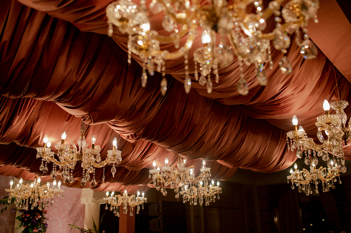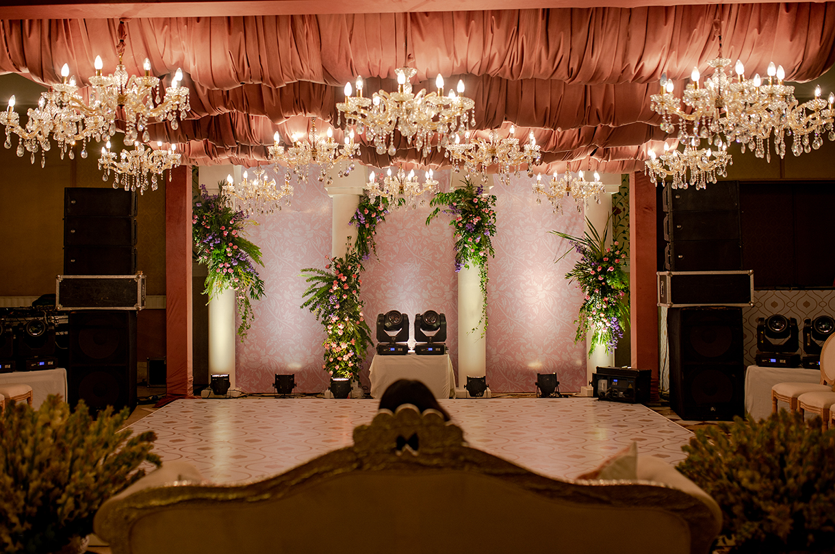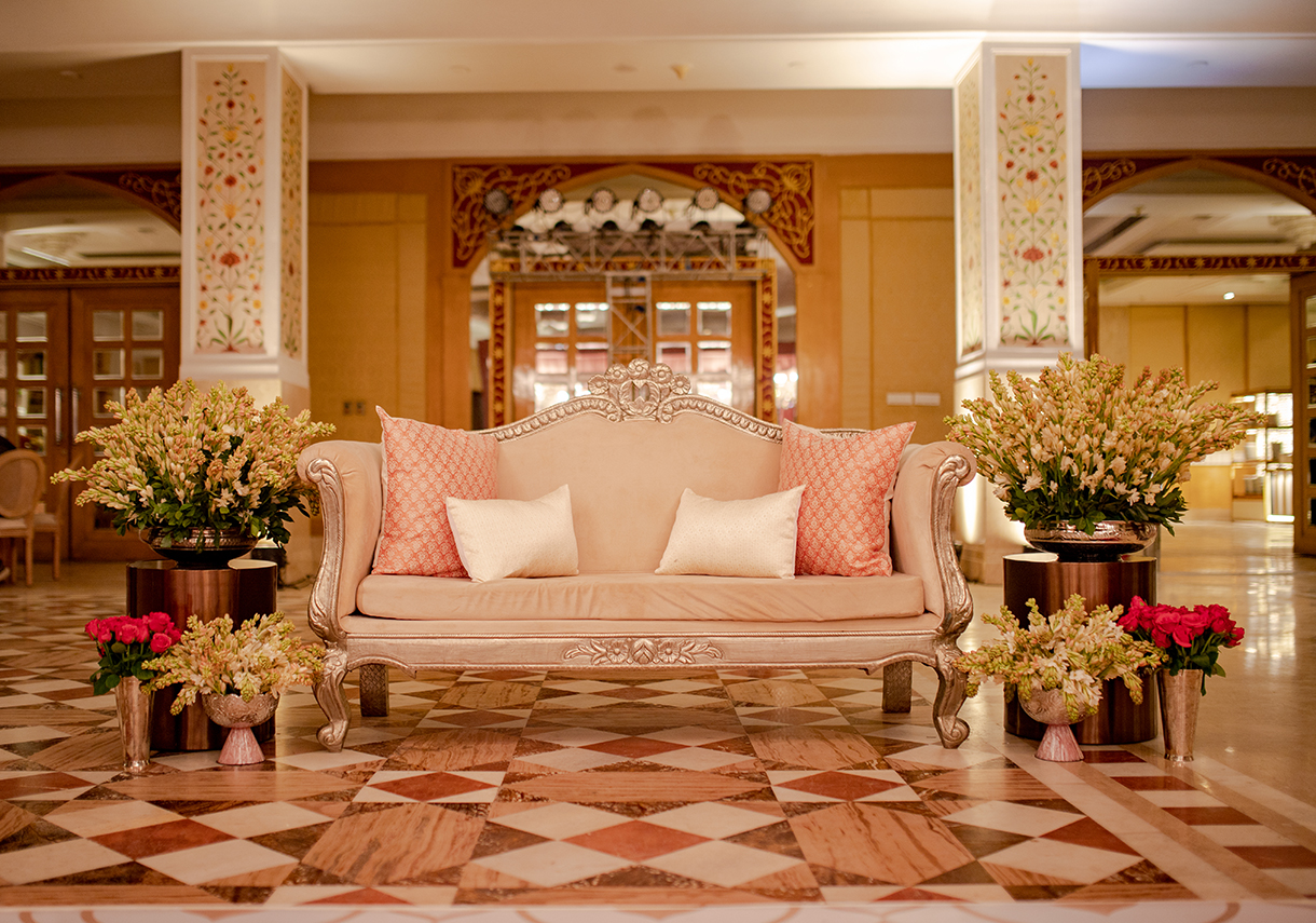 A surprising escape from the typical glitz and glamor of Sangeet function, the decor for the evening was imagined in a unique yet sumptuous palette of dusky rose and coral. A modern take on Indian royalty and luxury, the occasion was replete with antique memorabilia, rich florals, and plush drapes that wove a stunning visual journey.