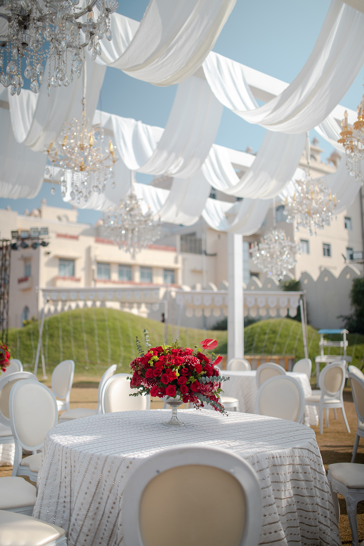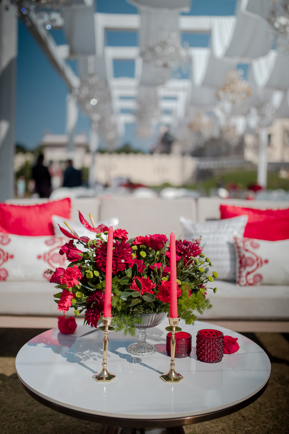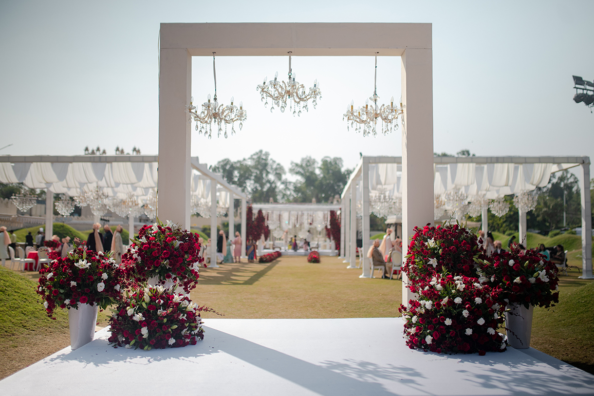 Crafted in a pristine ivory palette with pops of bright red, the wedding ceremony was a feast for the eyes. Billowing drapes and crystal chandeliers hung above while elegant white seating arrangements were elevated with red cushions, candles, and flowers. The highlight however was the mandap, a breathtaking confluence of red flowers and crystal hangings that stood at the end of a stunning floral aisle. The beauty of the setup was enhanced by warm lights as the evening progressed, and the couple’s lovely union was immortalized by a live painting of the mandap.