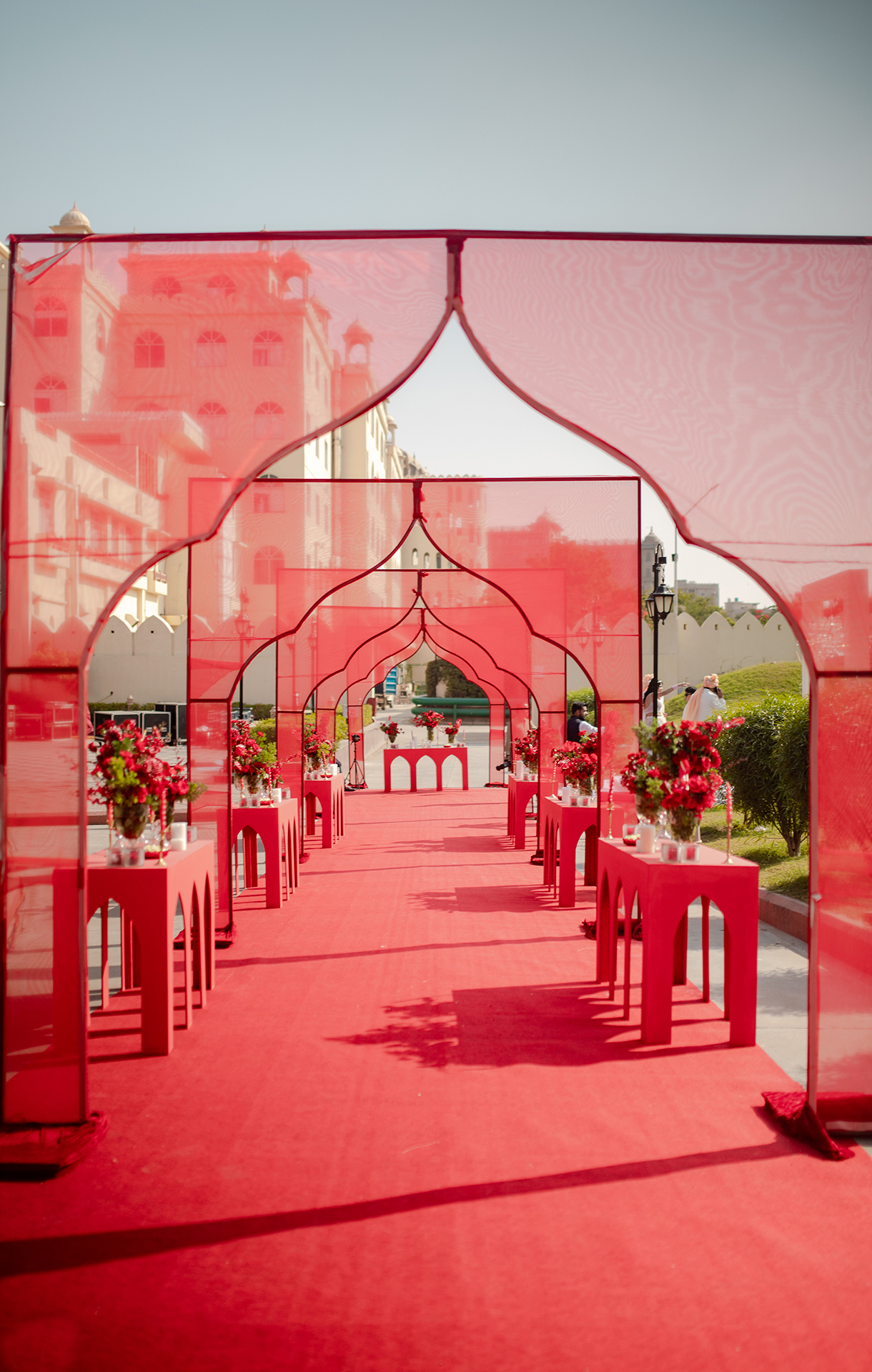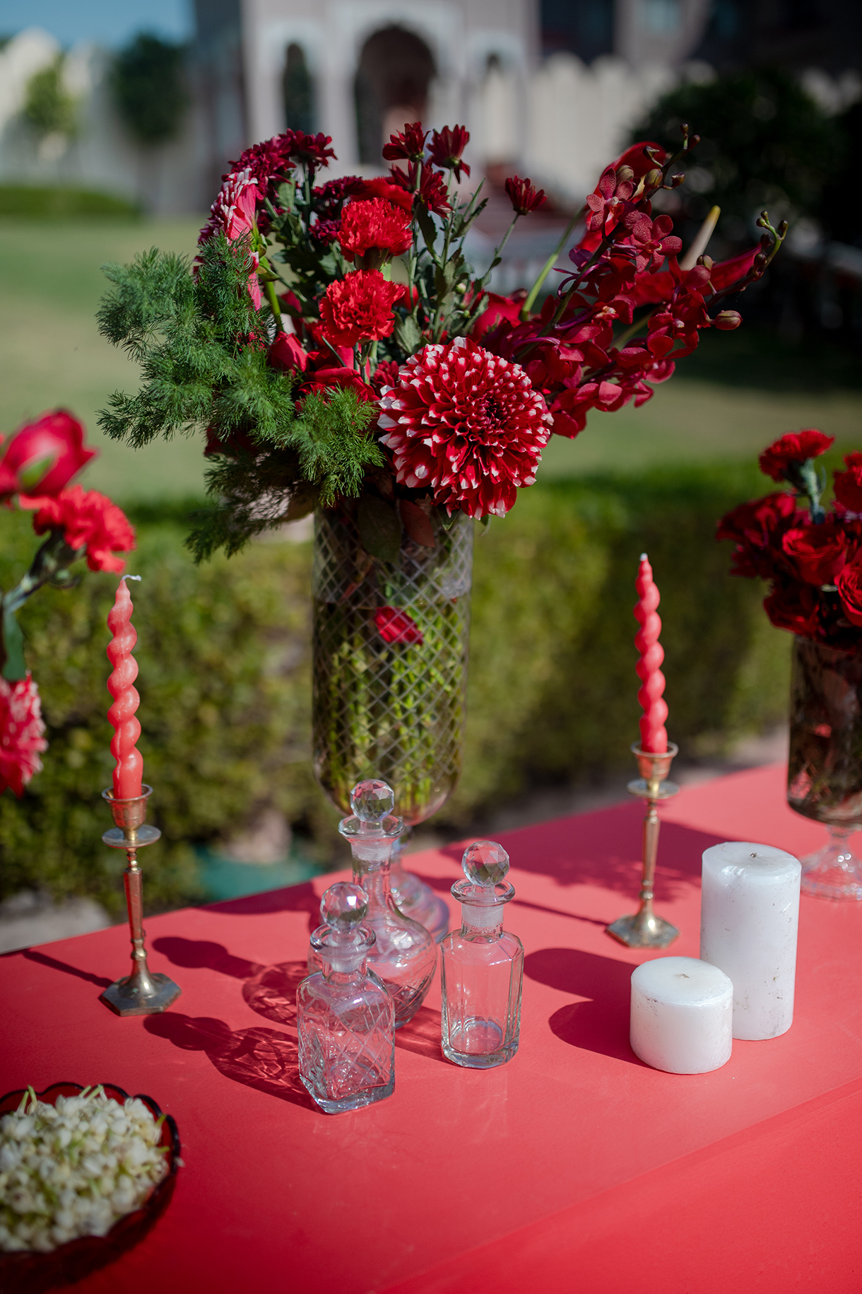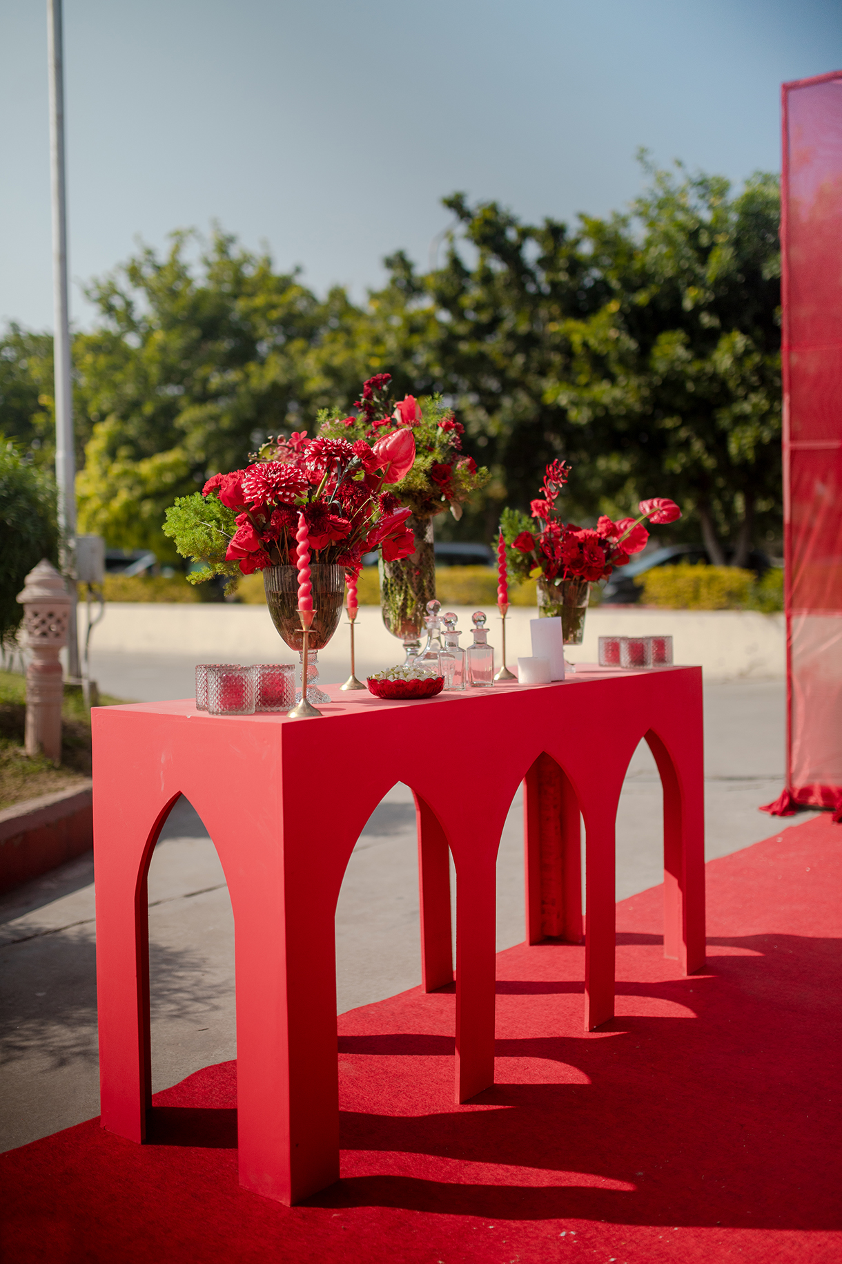 Crafted in a pristine ivory palette with pops of bright red, the wedding ceremony was a feast for the eyes. Billowing drapes and crystal chandeliers hung above while elegant white seating arrangements were elevated with red cushions, candles, and flowers. The highlight however was the mandap, a breathtaking confluence of red flowers and crystal hangings that stood at the end of a stunning floral aisle. The beauty of the setup was enhanced by warm lights as the evening progressed, and the couple’s lovely union was immortalized by a live painting of the mandap.