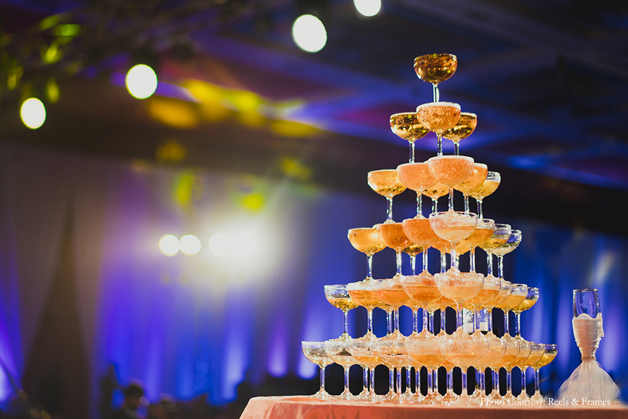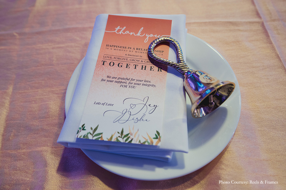 The couple too enjoyed their first dance which was followed by the popping of champagne and cake-cutting. To bless and celebrate the couple’s new beginnings, their guests rang mini bells that were placed on each table. The engagement rings were brought to Jay and Disha by their respective brothers.