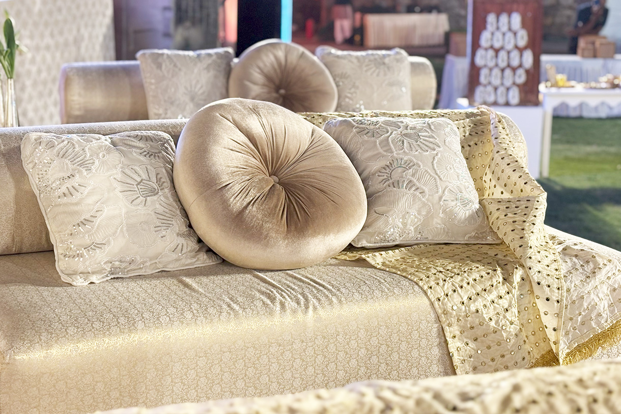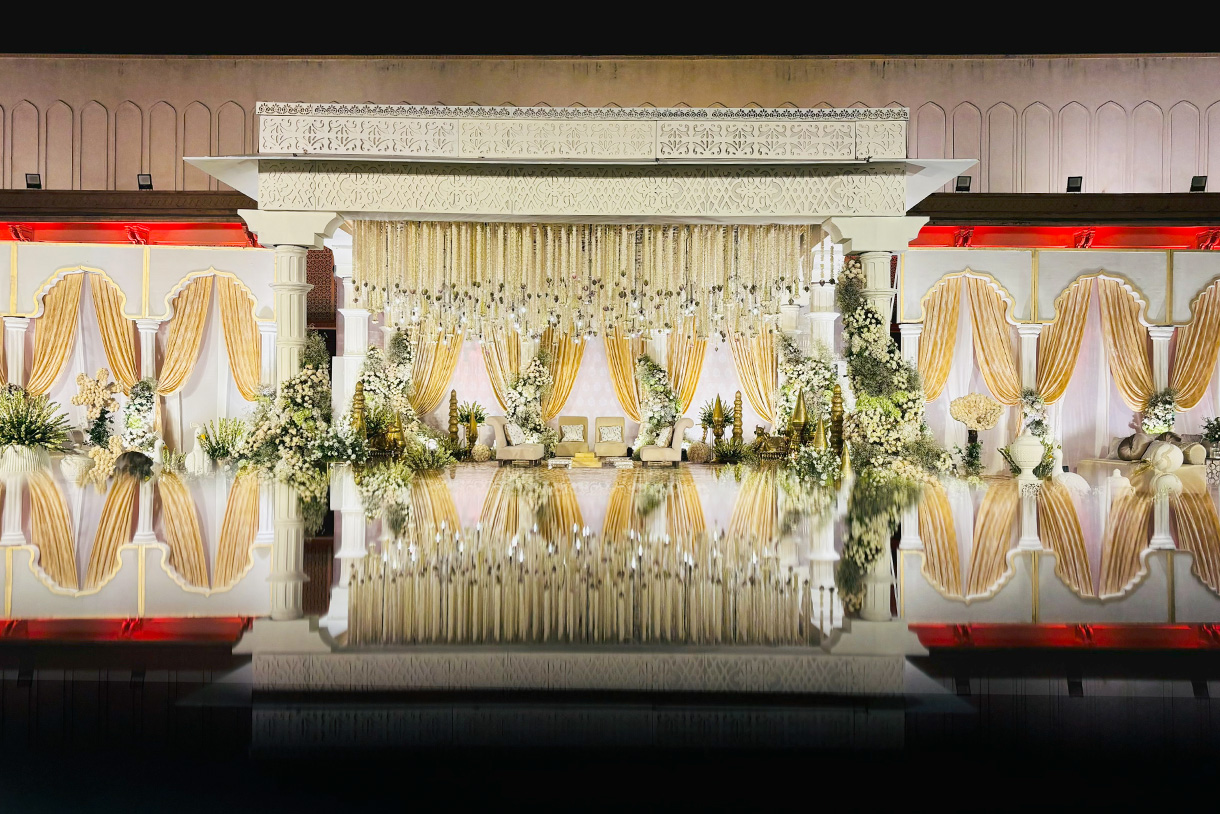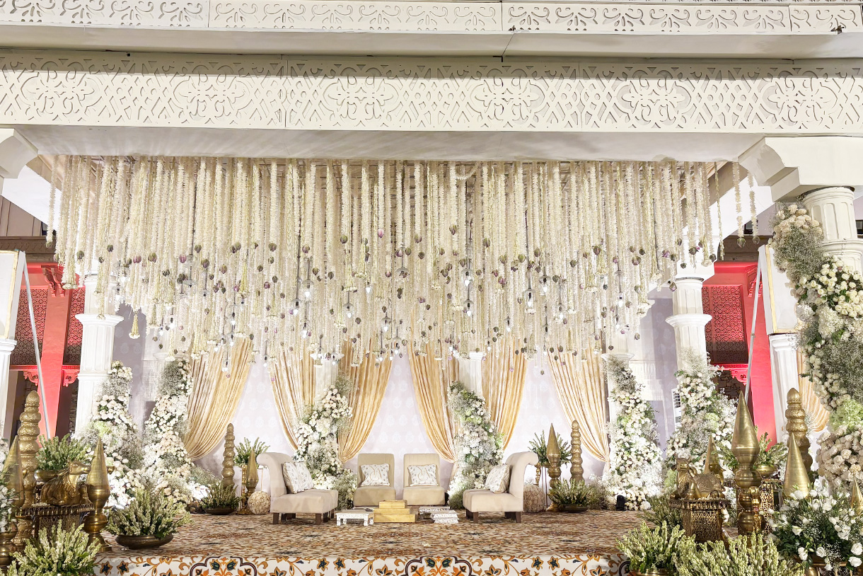 Ornate jharokha-style frames stood tall behind plush ivory seating, their arches flanked by classical columns and suspended chandeliers that shimmered with restrained elegance. Kamrul Hasan Khan of Knotie Production shares, “Our design process was centred around balance. We wanted the décor to feel luxurious but never loud. Every element had to echo grace and the beauty of restraint.”