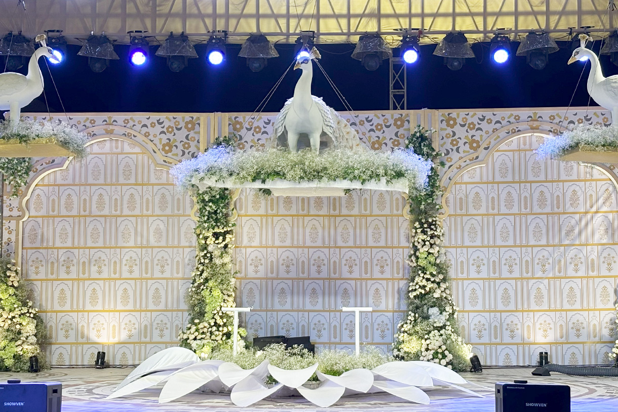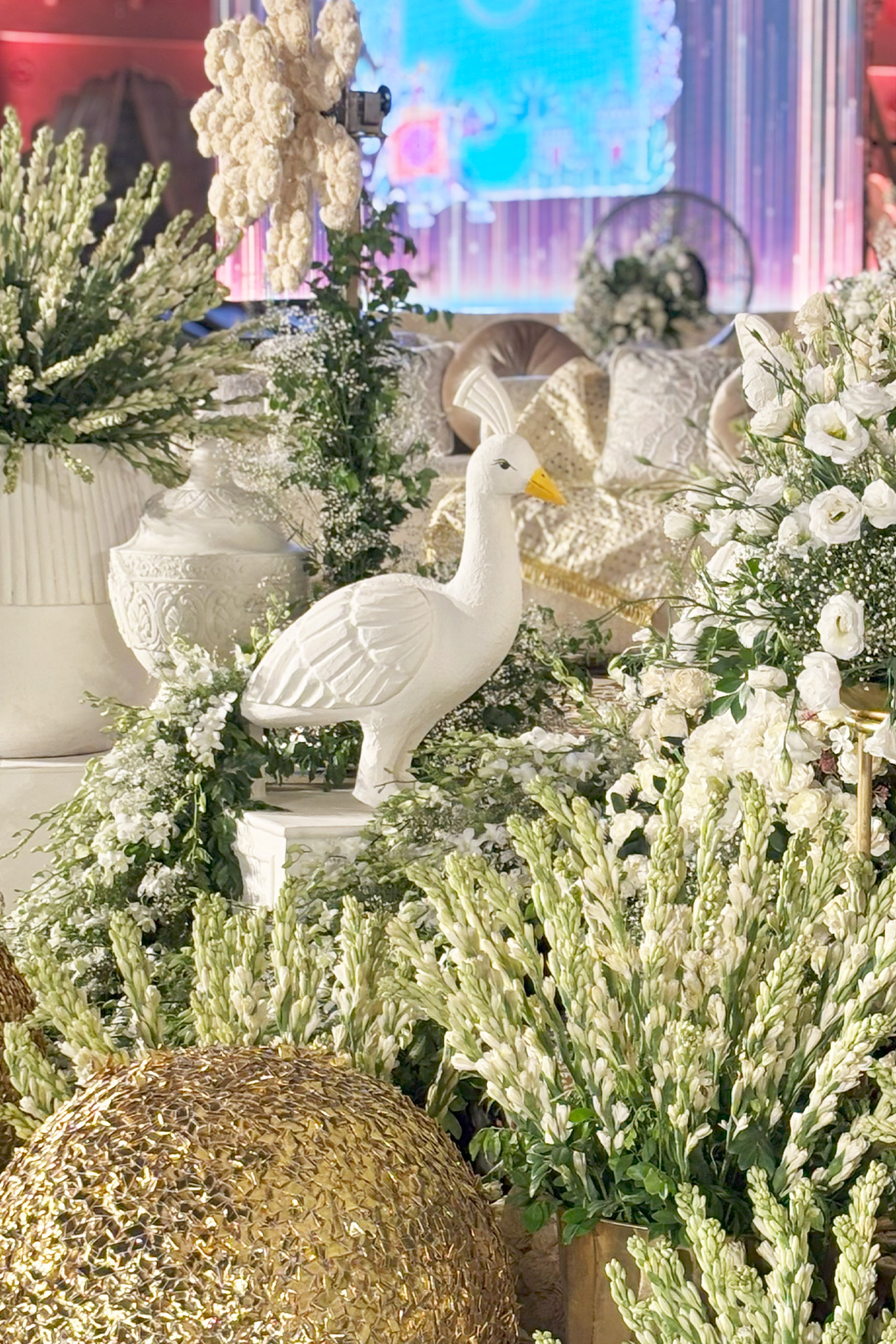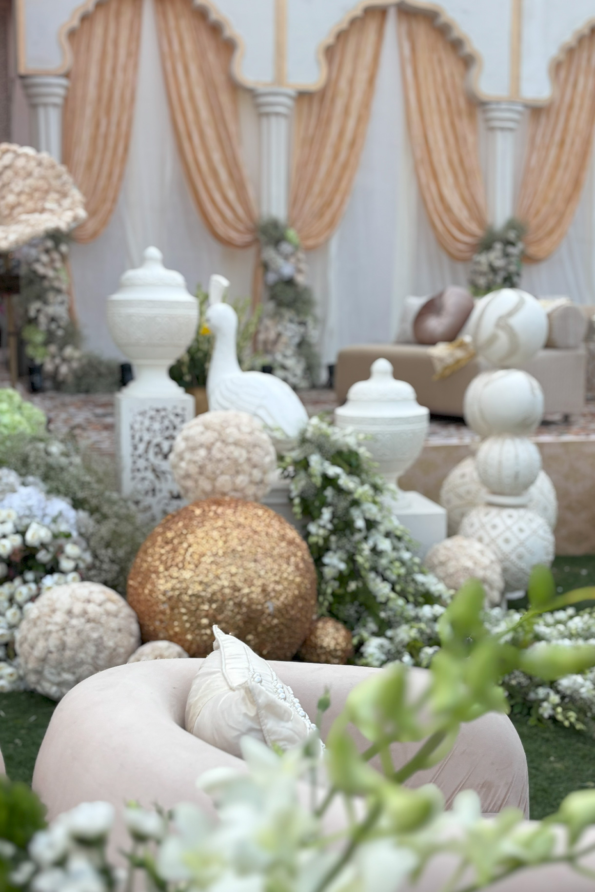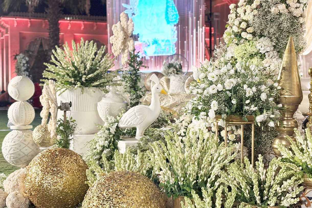 Guests entered through Mughal-inspired arches draped in soft gold-printed velvet, their intricate patterns glowing under warm ambient lighting. The pathway opened into a serene courtyard where ivory floral sculptures, layered gota balls, and gleaming gold globes created a setting that was both opulent and dreamlike. White peacocks—crafted entirely from florals—stood poised as though caught mid-dance. Each element flowed seamlessly into the next, from cascading tuberoses and lisianthus to grand floral fountains that served as ethereal centrepieces within the lawn.