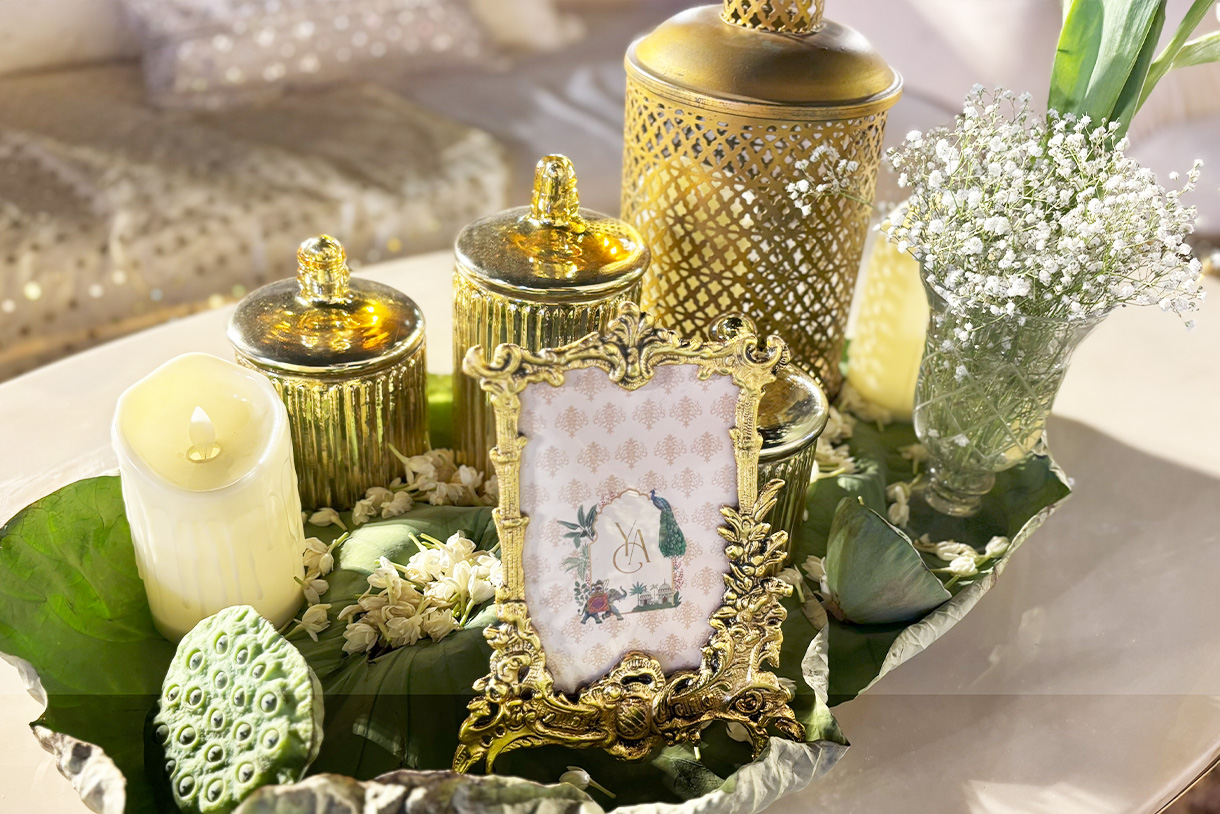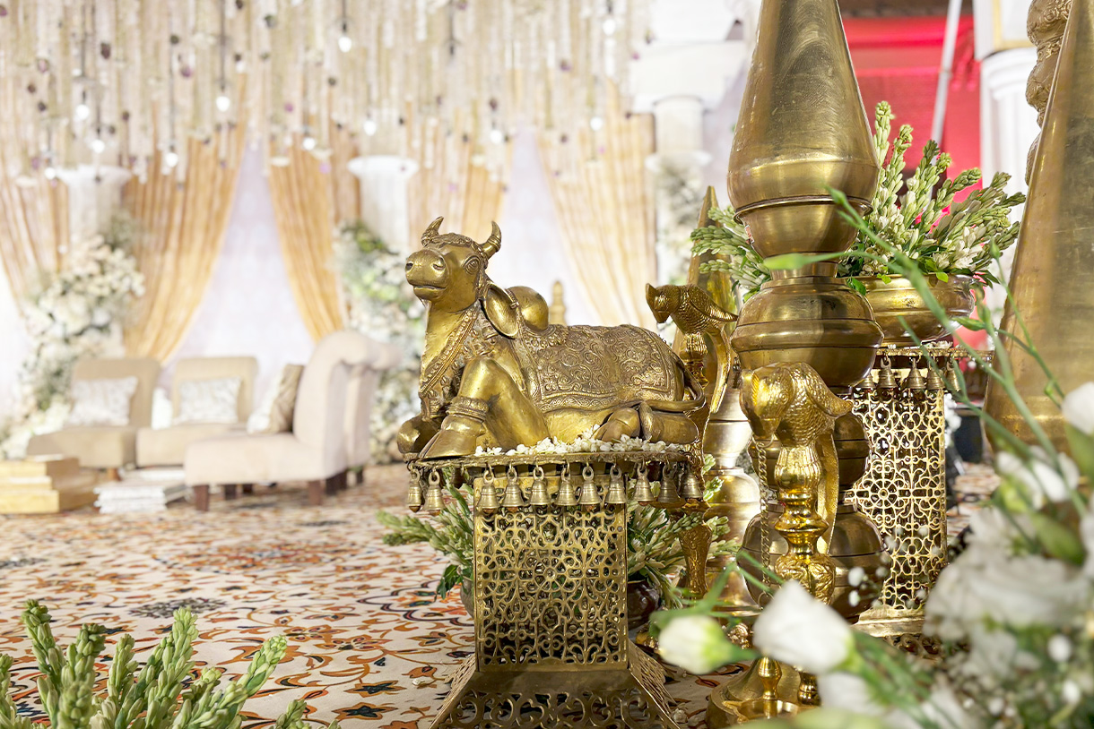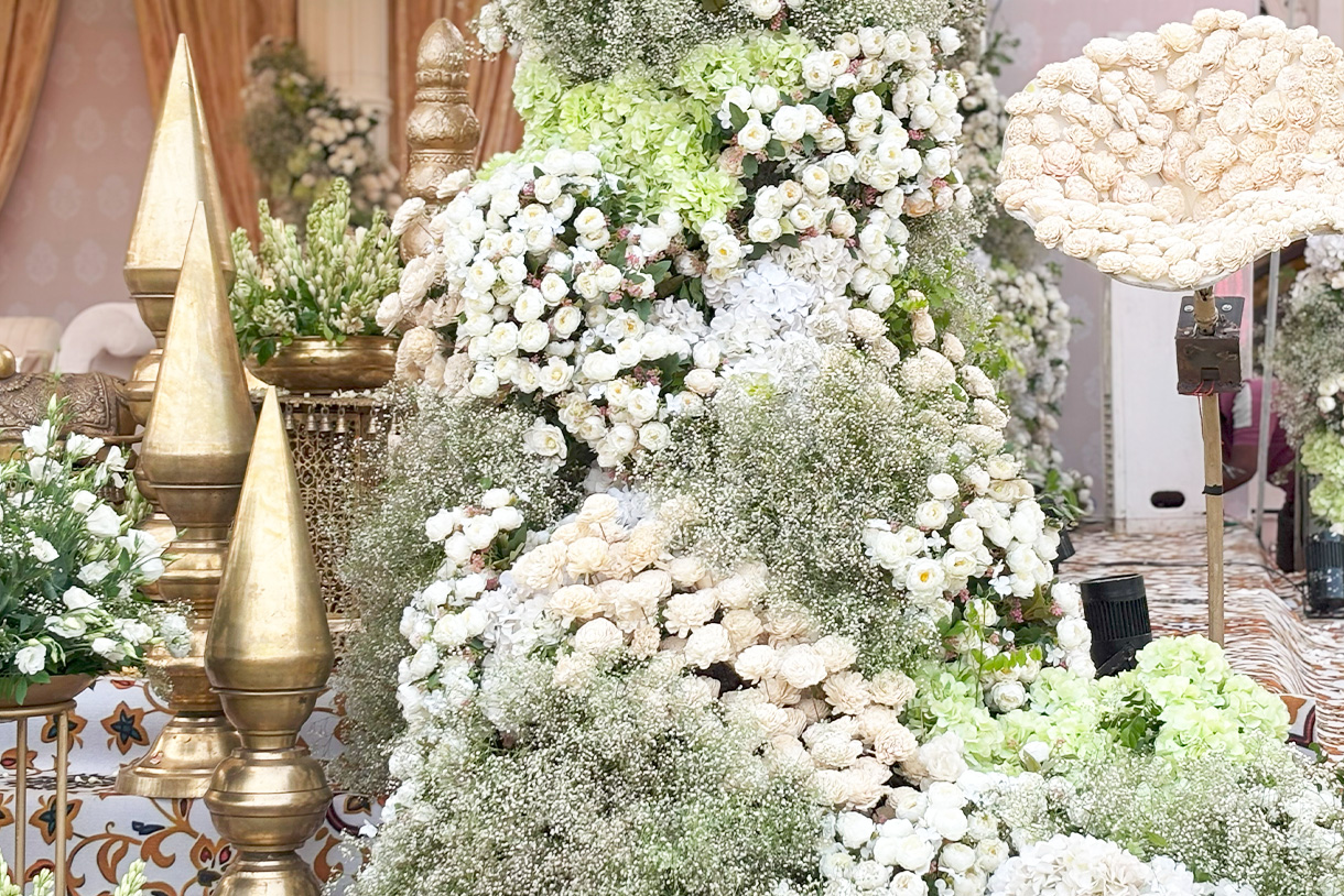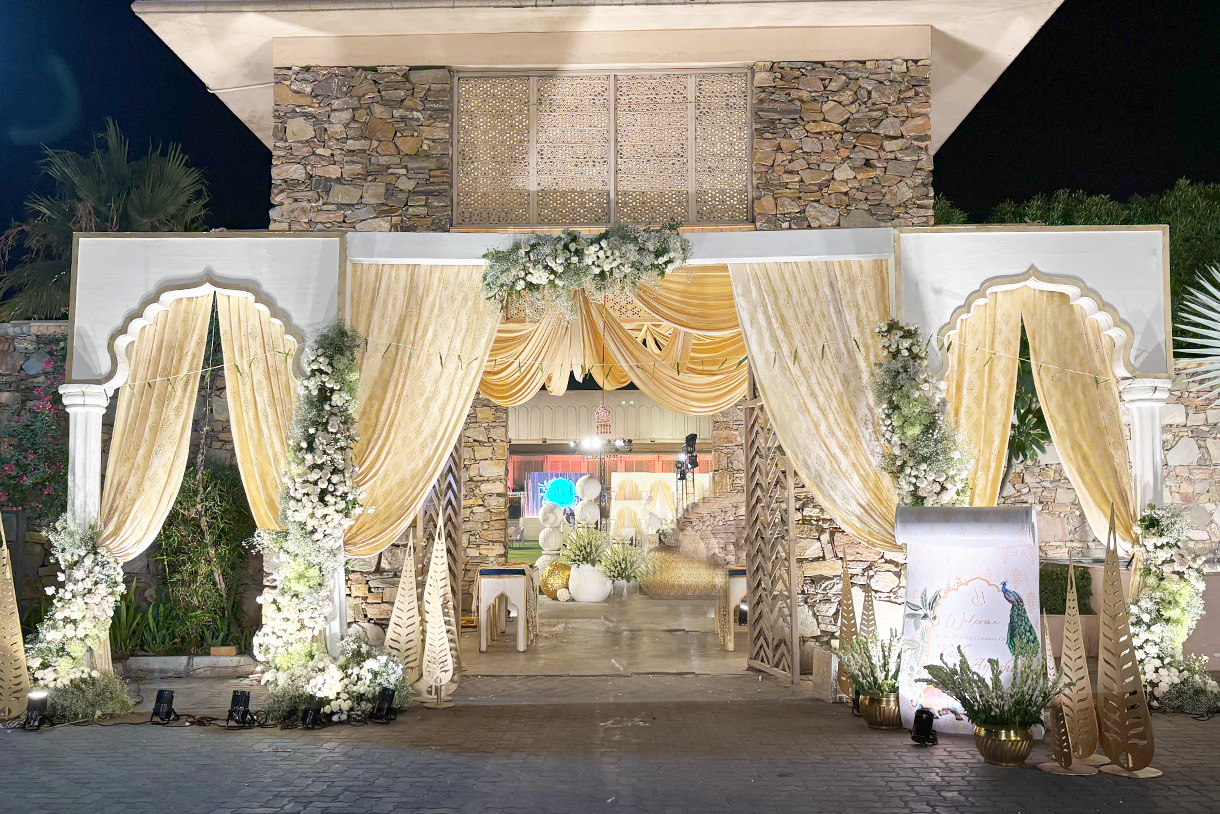 Guests entered through Mughal-inspired arches draped in soft gold-printed velvet, their intricate patterns glowing under warm ambient lighting. The pathway opened into a serene courtyard where ivory floral sculptures, layered gota balls, and gleaming gold globes created a setting that was both opulent and dreamlike. White peacocks—crafted entirely from florals—stood poised as though caught mid-dance. Each element flowed seamlessly into the next, from cascading tuberoses and lisianthus to grand floral fountains that served as ethereal centrepieces within the lawn.