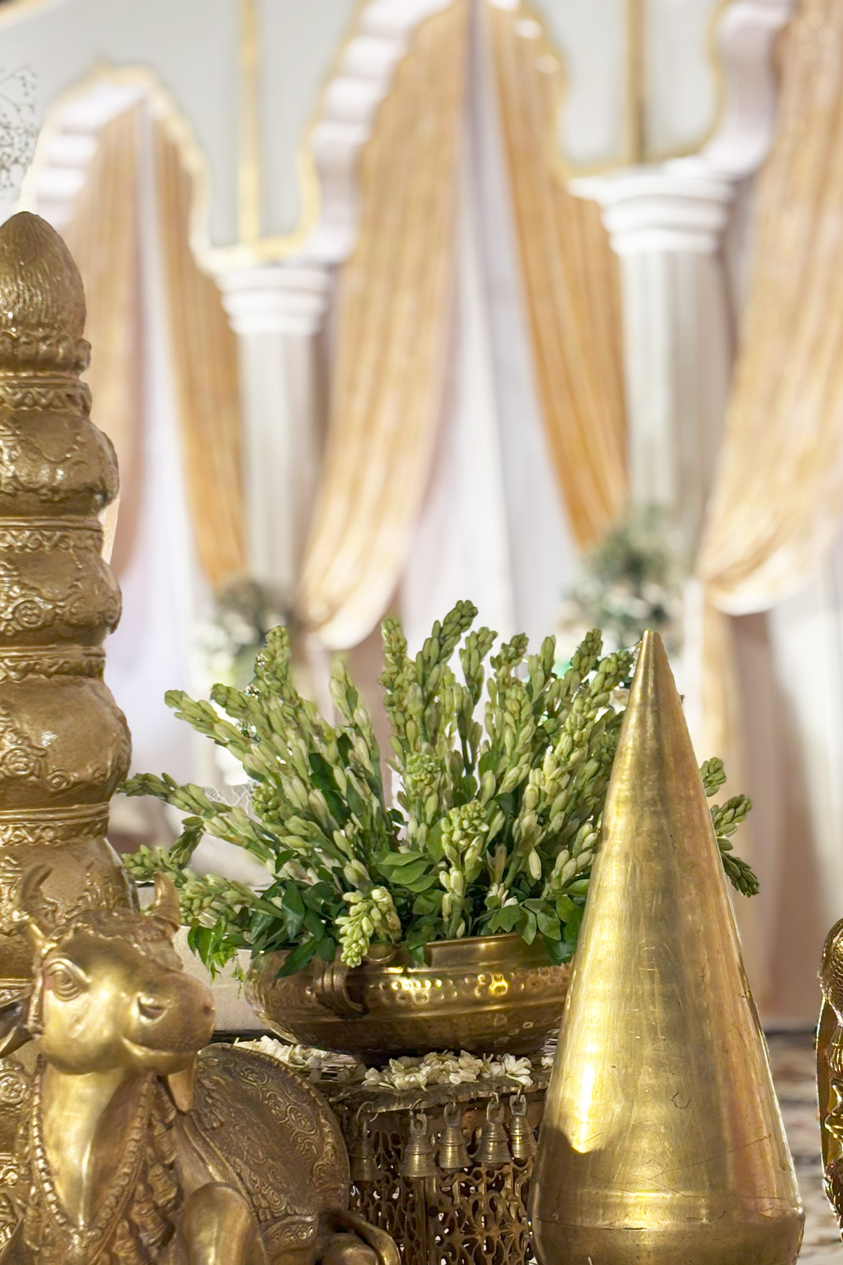 The natural surroundings of the venue were gently embraced, never overshadowed. Bougainvillaea-laced pathways, soft lighting, and a palette of ivory, cream, and antique gold allowed the celebration to breathe. The florals, both abundant and airy, were carefully placed to enhance rather than overpower. The interplay between structured installations and organic blooms made the entire wedding feel like a living painting, where tradition met tranquillity.