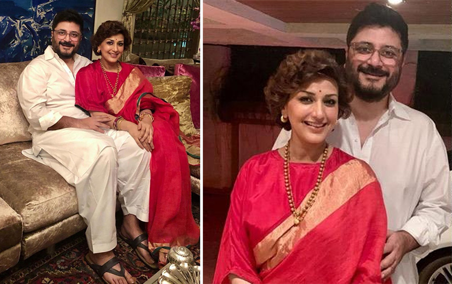 The actress wore a traditional red silk saree with minimal gold jewelry for Karwa Chauth and posed for a adorable photo with husband Goldie Behl.