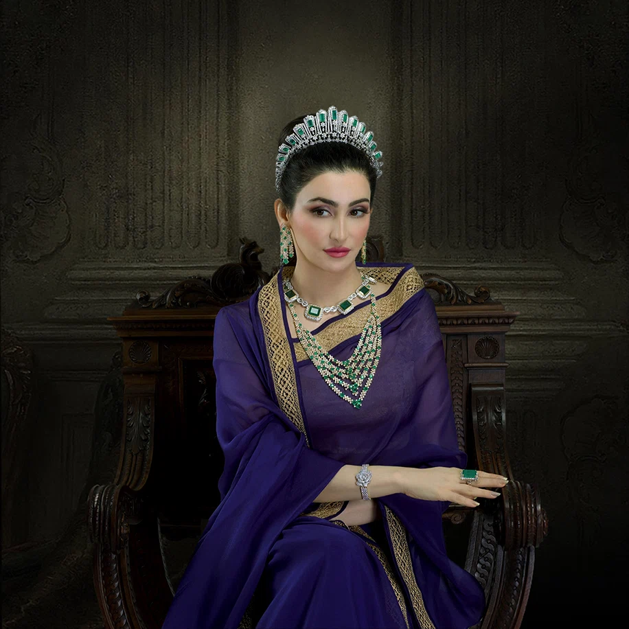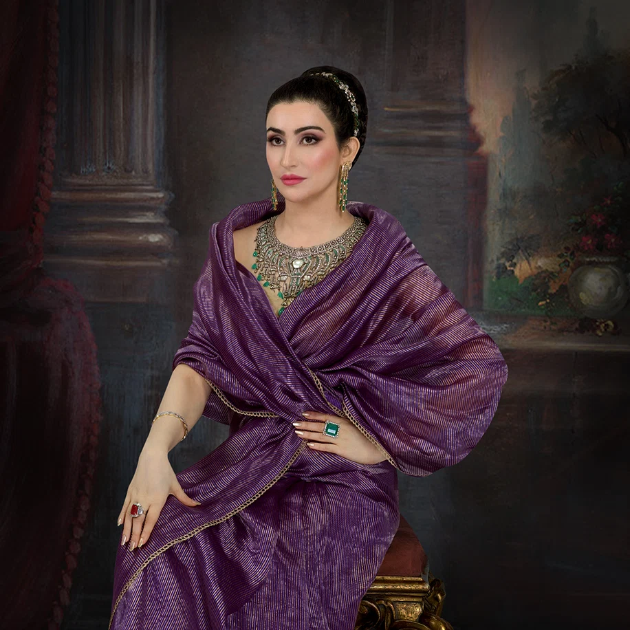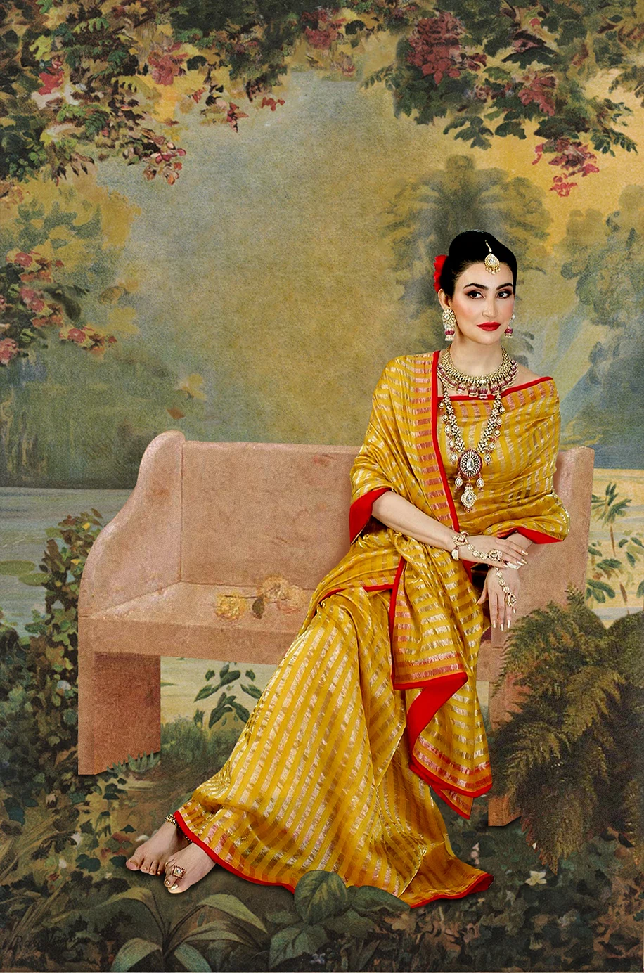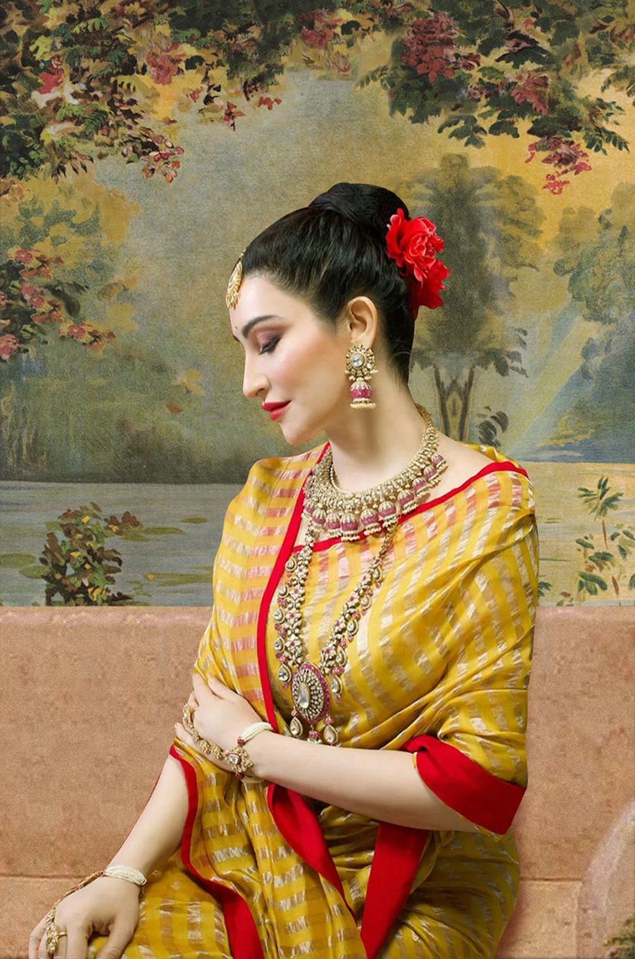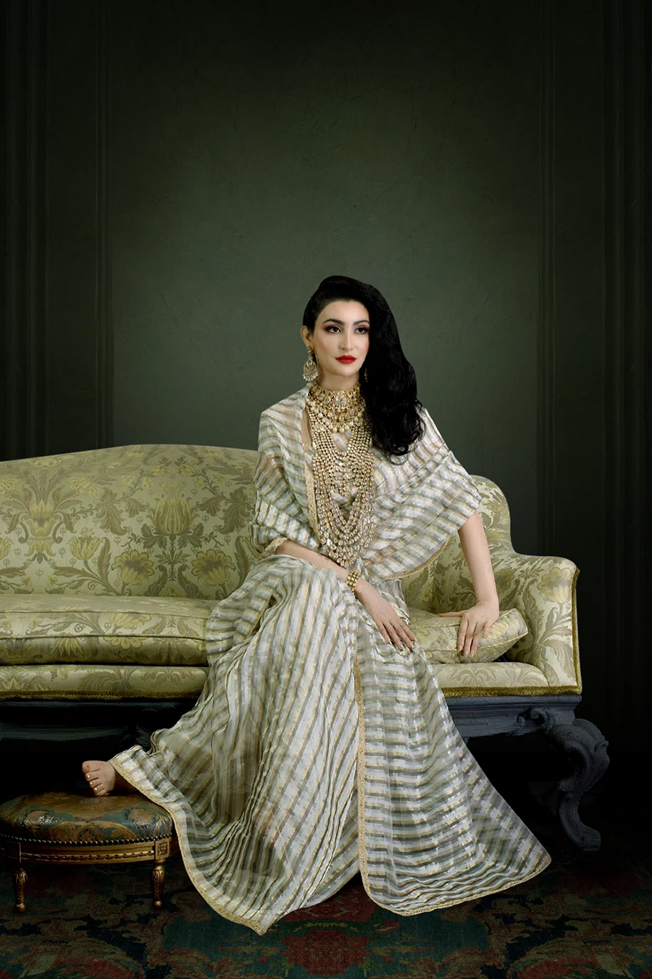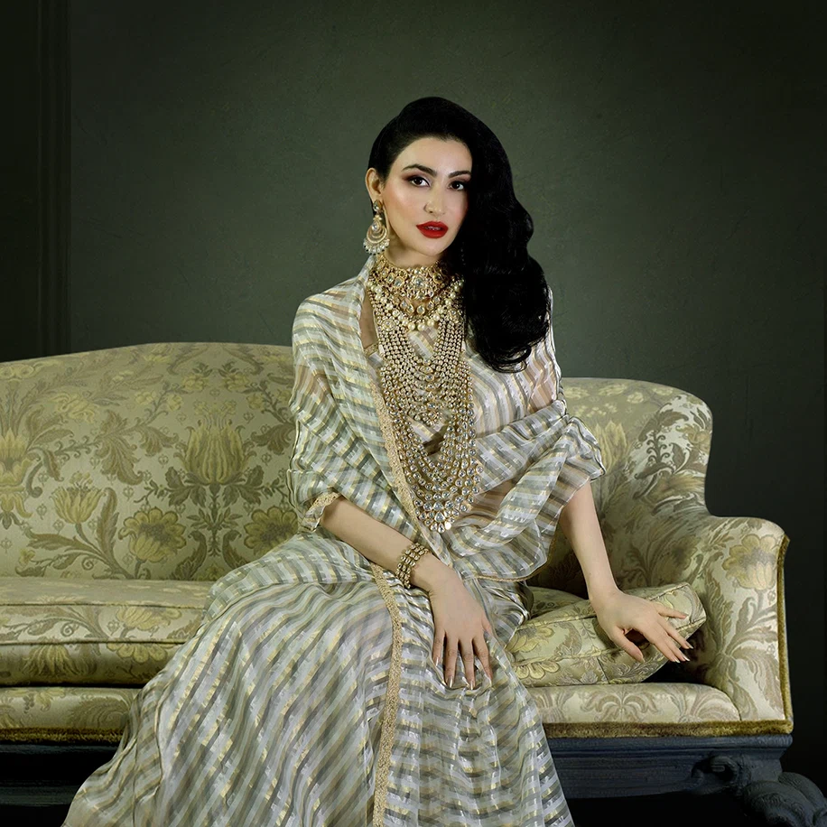 An ode to the astounding saree style of Indian princesses, the collection is the epitome of elegant minimalism and channels the richness of hand-woven Indian textiles. Worn with gold, Polki and diamond ornaments from legacy jewelry houses like Moti Jewels Palace and Birdhichand Ghanshyamdas, the styling also reflects the splendor of Indian princesses and their penchant for teaming magnificent jewels with their sarees.
