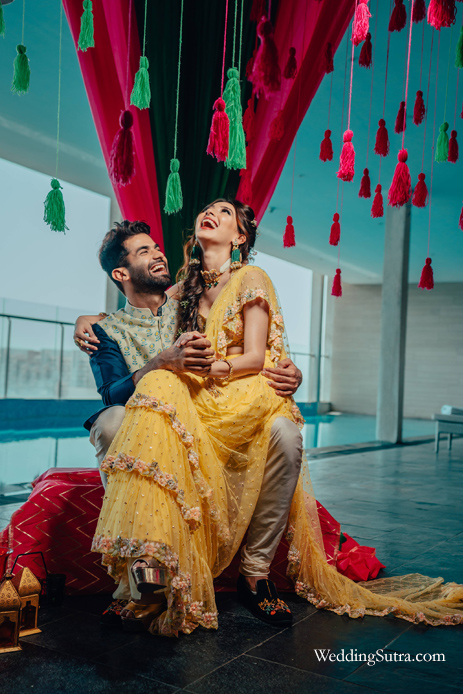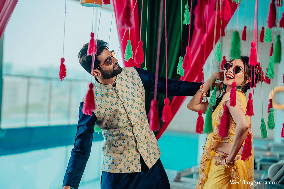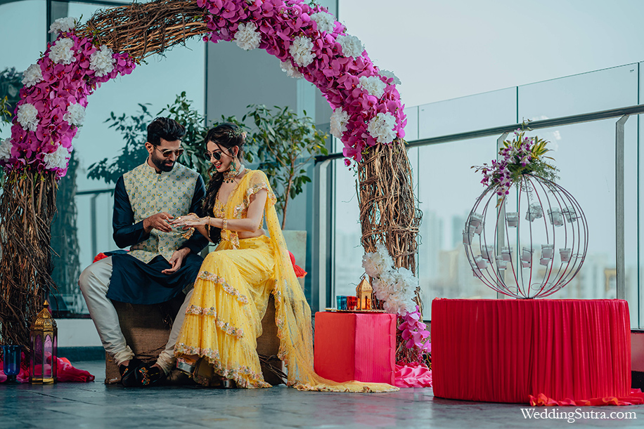 Charming colors find their place at the serene poolside of Vivanta Pune, Hinjawadi. A covered venue that opens up to a terrace welcomes abundant natural light that floods the spaces colossal windows. An ideal choice for daytime pre-wedding events such as a fun and lively mehndi, the venue offers the best of indoor and outdoor settings that come to life in shades of teal and fuschia. A gorgeous seat for the couple under an arch of branches festooned with purple and white blooms is placed perfectly on the deck by the pool and other quirky elements enhance the appeal of the aesthetics.