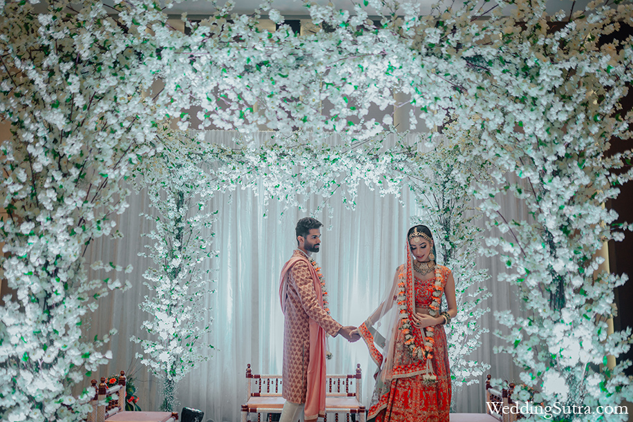A fairytale wedding with up to 500 guests unfolds at one of the largest and classiest ballrooms in the vicinity – The Concorde Ballroom, where beautiful chandeliers bathe the spaces in an ethereal glow. The wonderful interiors display a palette of elegant hues and invite ample opportunities for moments steeped in sophistication. Fresh white flowers and delicate drapes are used alongside green accents that light up the beguiling setup. Once the guests walk through the beautifully decorated pre-function area they lay their eyes on the most captivating mandap that is covered with white blooms and sits at the end of the aisle dressed in the same hue.