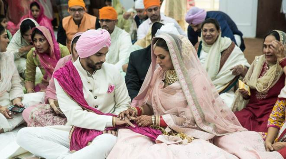 Bollywood actress and talk show host Neha Dhupia tied the knot with actor Angad Bedi in a hush-hush ceremony in a gurudwara in New Delhi. We loved how the bride looked enchanting in a pastel pink lehenga by Anita Dongre with coral pink and mint embroidery and gota work.