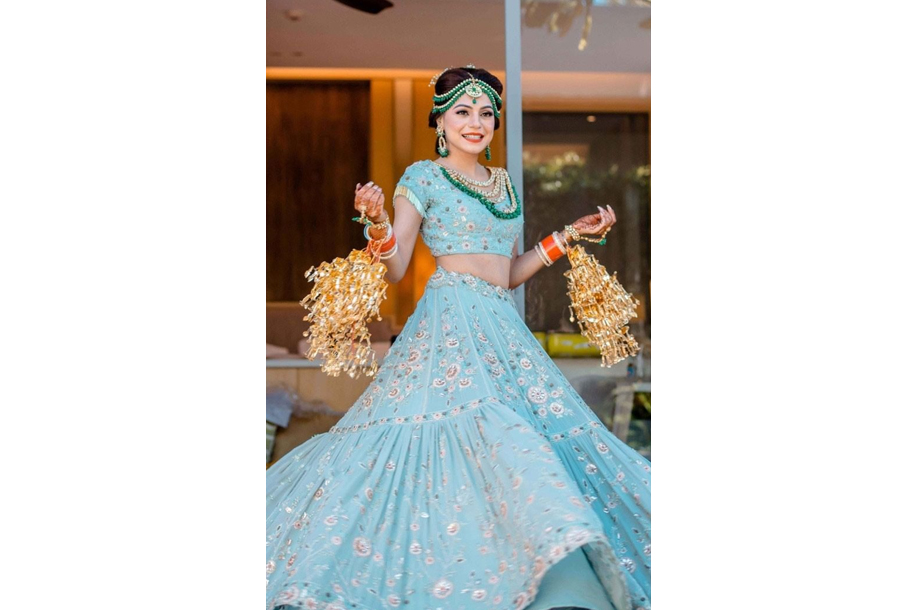 Keep it cool and breezy yet trendy in this unique powder-blue lehenga with floral details and fringed sleeves.