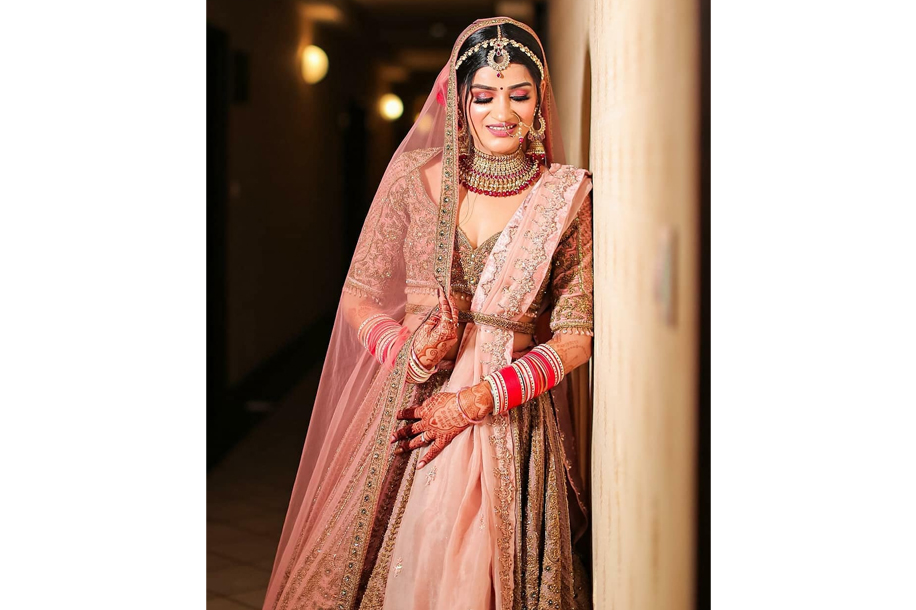 This peachy pink lehenga with its scalloped gold embroidery emanates soft glam.