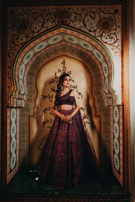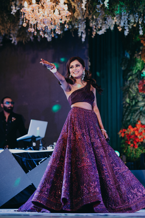 A sweet confluence of modern and traditional, this one-shouldered purple lehenga is perfect for a boisterous sangeet celebration.