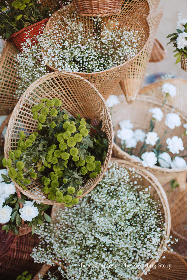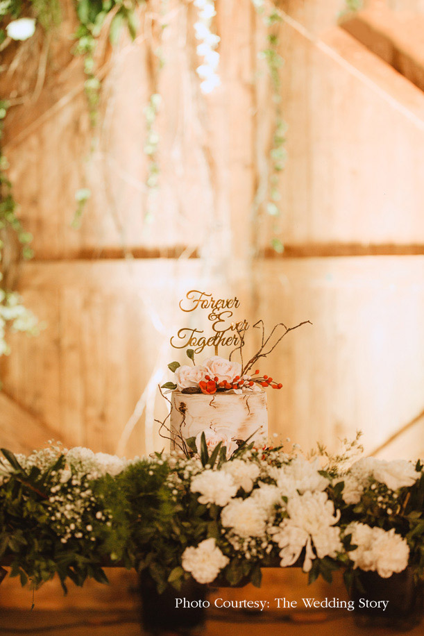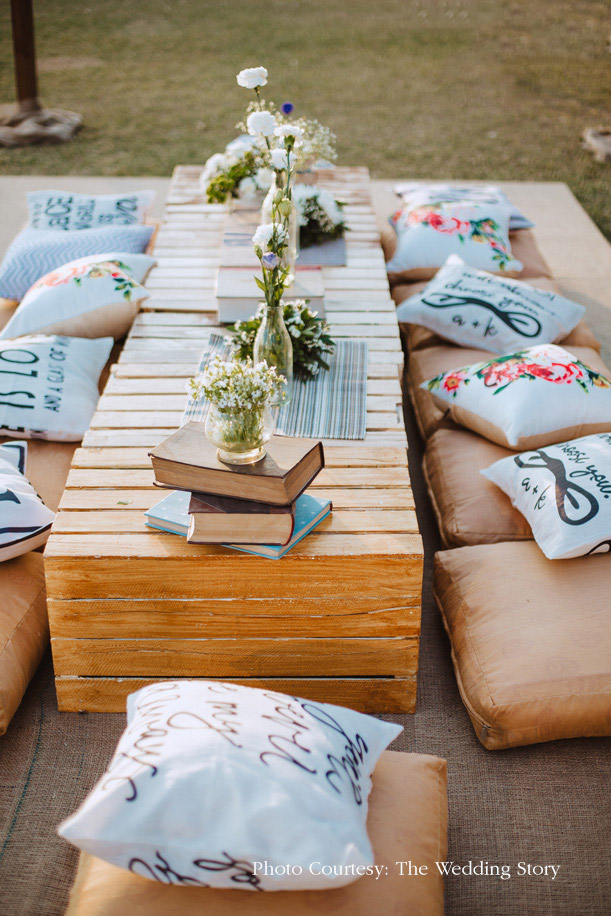 “The theme was Vintage Chic with an Oktoberfest influence. We festooned the lakeside lawns with vintage props like antique sewing machines, rotary dial telephones, vintage leather covered books, vintage suitcases and typewriters for old-world charm. Guests were seated on cane furniture with customized cushion covers, picnic tables with green and white exotic floral runners and the main cabana with low seating arrangements and lots of throw pillows. Casual chic at its finest.