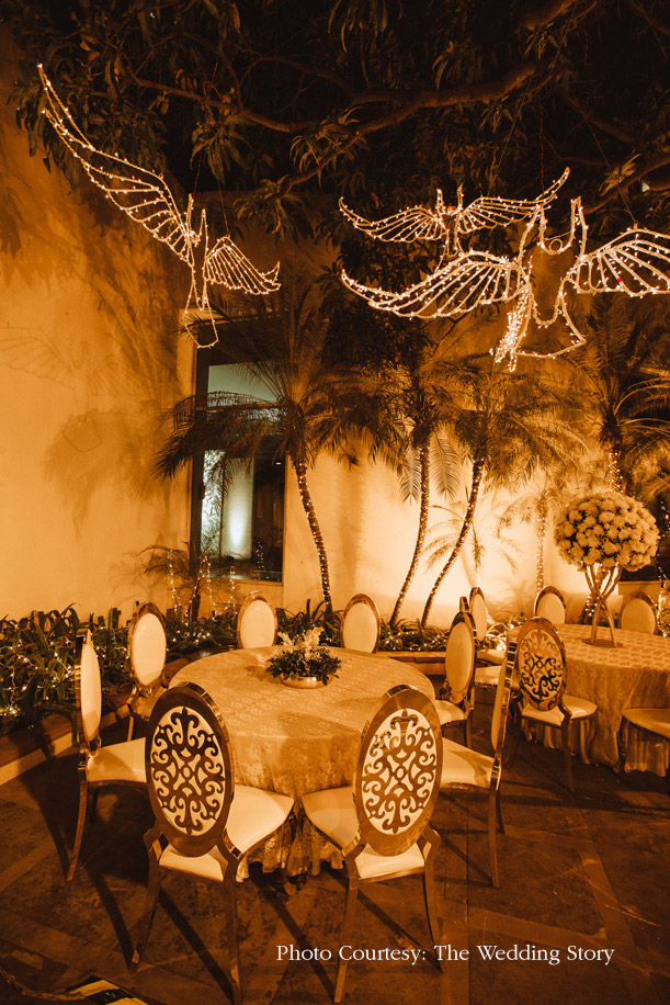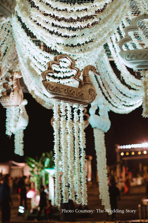 Lounges were created with modern Indian prints in English colors, vintage props, console tables, candle stands and tall brass tumblers. The head table had floral runners in white and green with Dior chairs and swan hangings with tuberoses.
