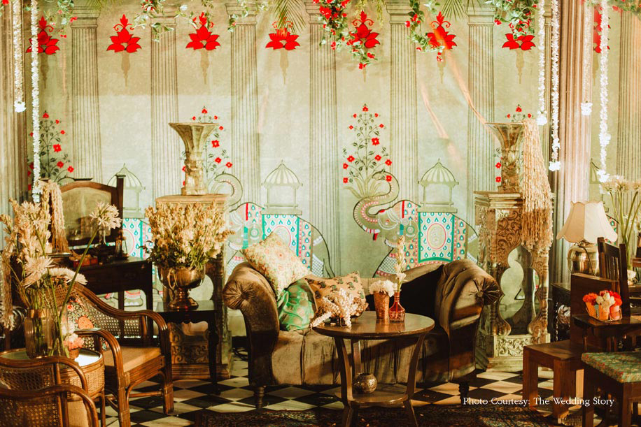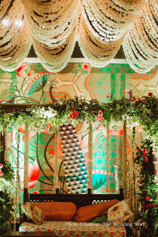 “The aesthetic at the wedding was that of a Modern Vintage drawing room with hints of a South Indian floral garden with kitschy Indian prints. We worked the most for this event’s detailing. Even the umbrellas for the baraat were printed with flamingoes.