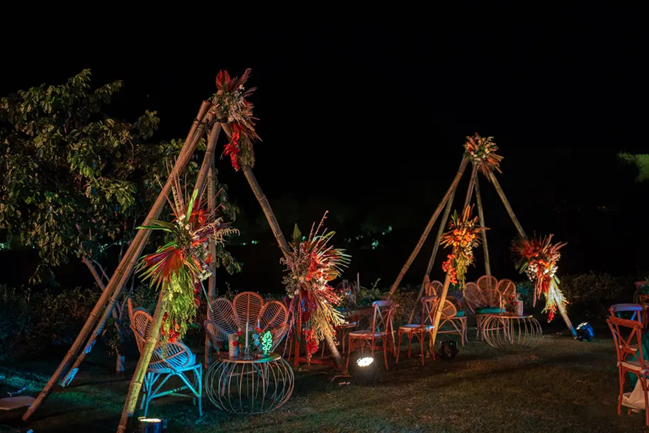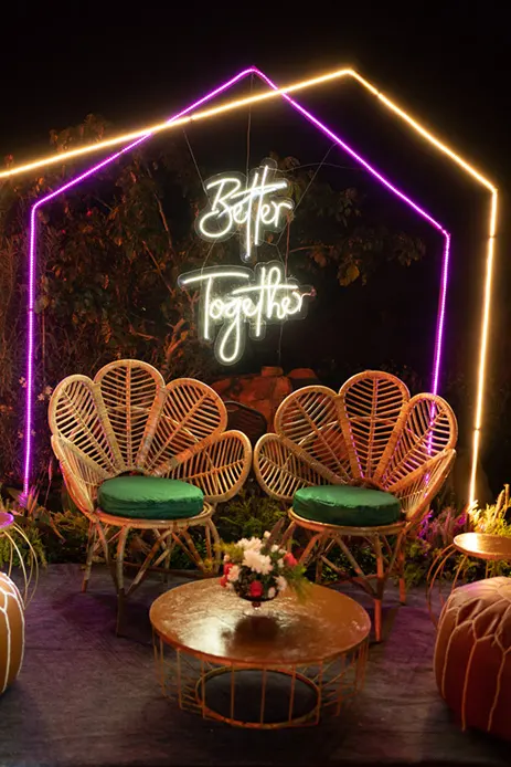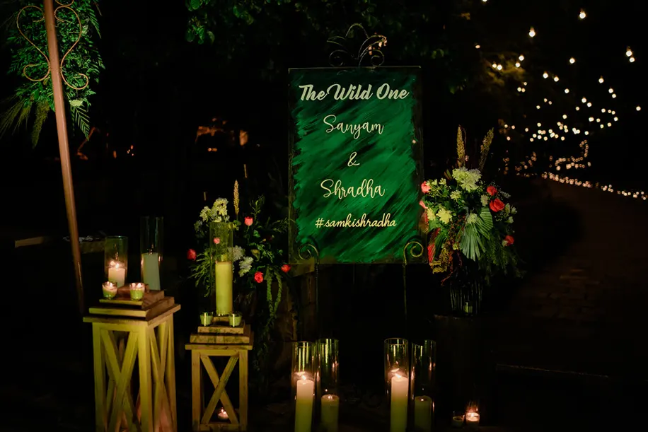 Next in line was an Amazon-inspired evening celebration. Ishan shares, “This was labeled ‘The Wild One’, the Amazon Jungle theme. It was full of lights, overgrown leaves, vines, flowers and neon lights that gave a magical aura to the event.”