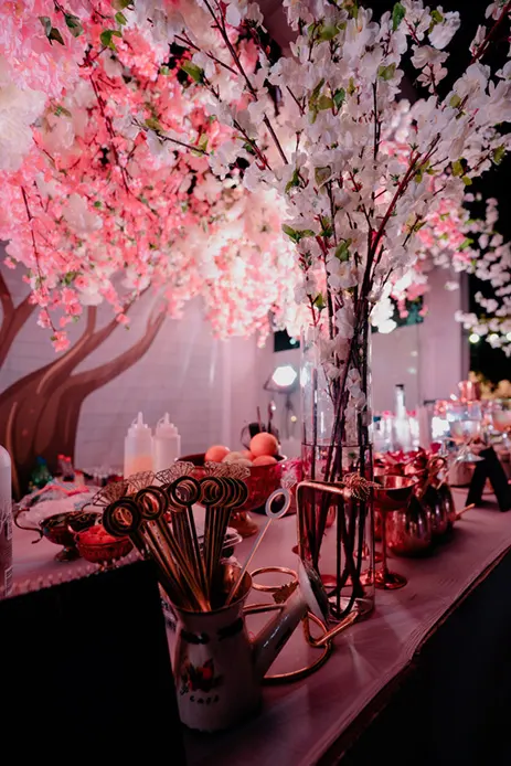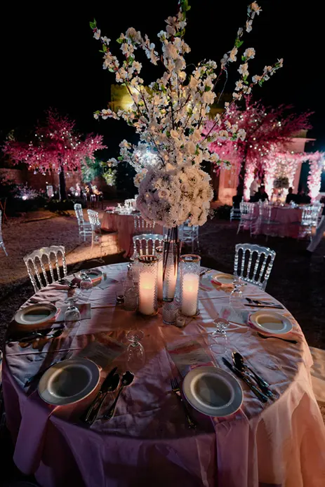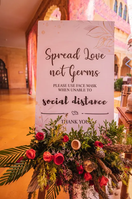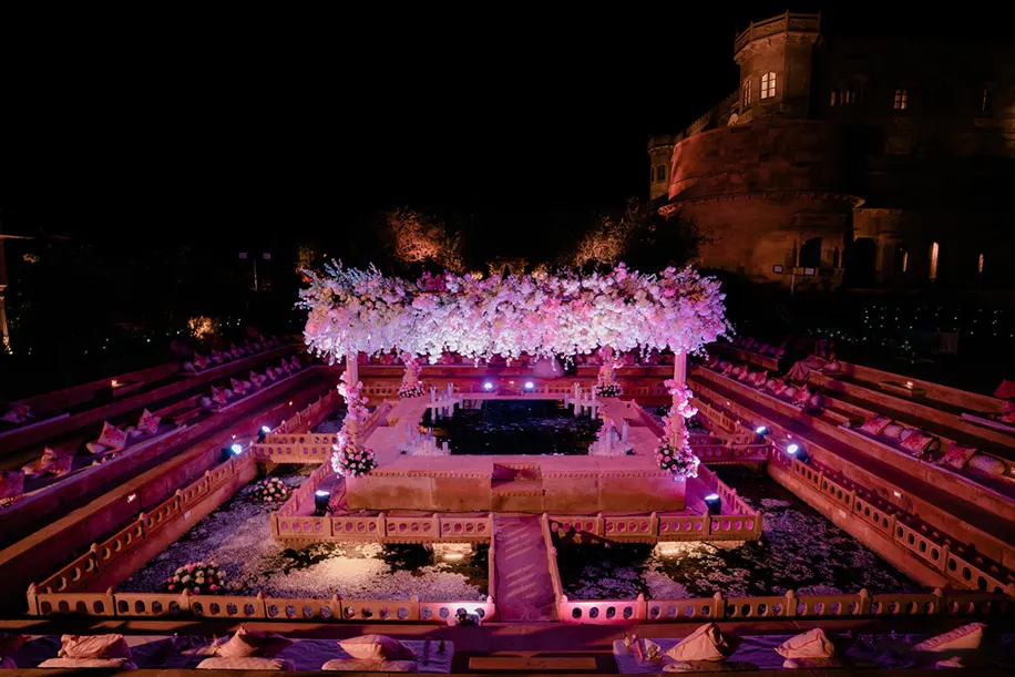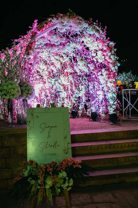 The couple then moved on to an event inspired by the delicate beauty of Japan. Ishan shares, “This one was a special celebration as a Christian Wedding was also hosted for the couple where they took their wedding vows again. Cherry blossoms in beautiful pink and white hues dominated the decor with acrylic furnishings for the guests. Overall, this was a fitting dream come true for the duo who previously had to tie the knot rather quickly given the pandemic.”