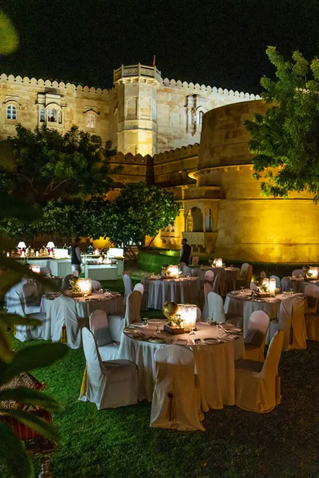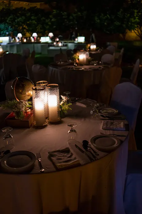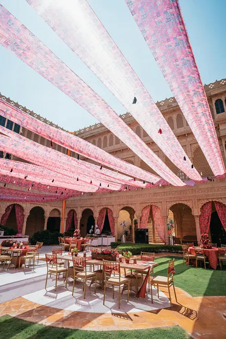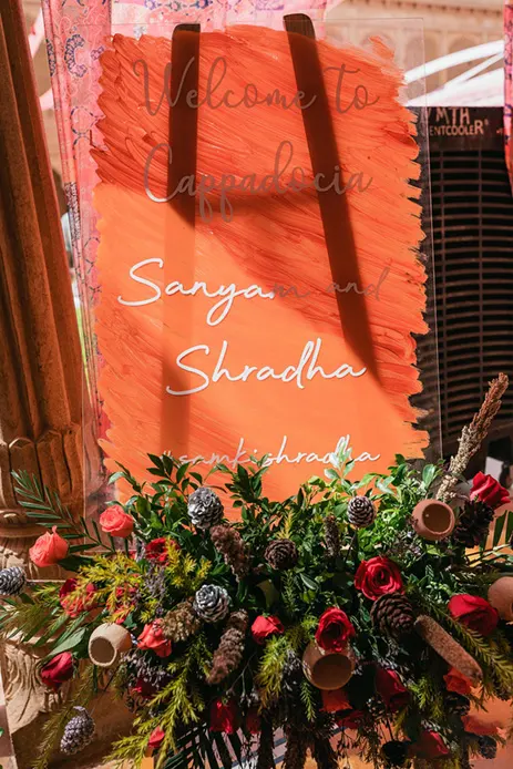 Ishan Rajawat from Desert Pearl Entertainment shares, “The couple shares a great love for traveling. Hence, the first post-wedding celebration was based on Cappadocia in Turkey where the couple had traveled during their first year of courtship. Filled with earthy elements and dominated by a subtle sepia hue, the decor encapsulated the striking beauty of Cappadocia. Lanterns, pampas grass and pinecones at the event exuded a magical vibe with hot air balloons illustrated on placards.”