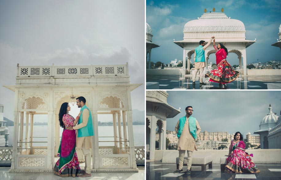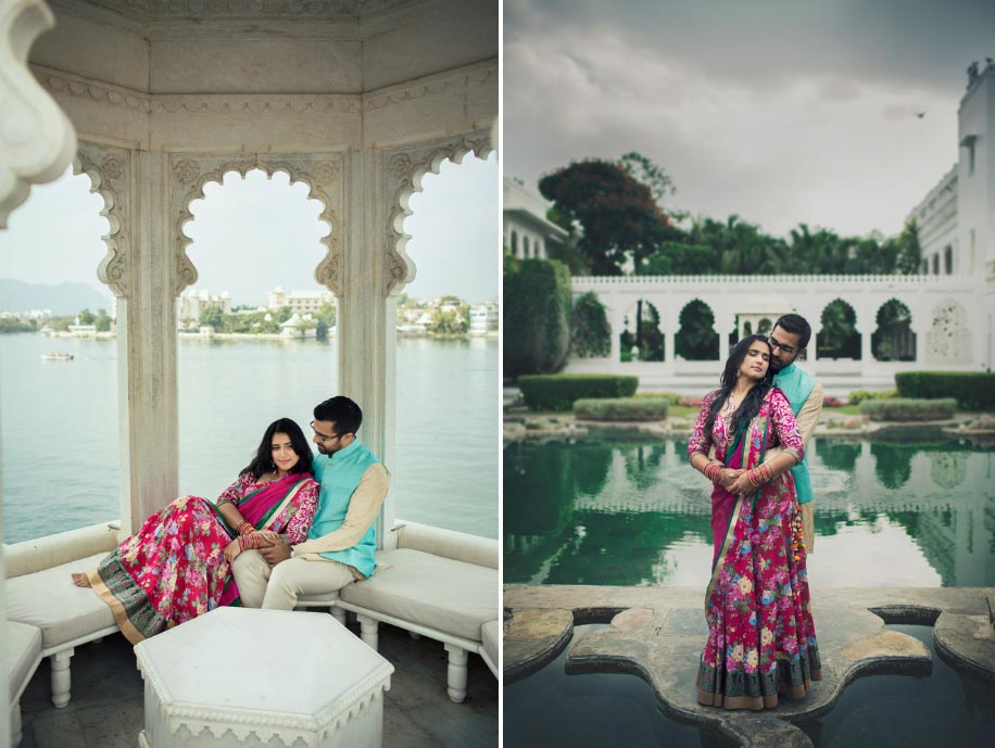 Shweta was right in her instincts when it came to choosing Taj Lake Palace for her engagement photoshoot as it has been voted as one of the most romantic hotels in the world. A stunning structure with a white marble exterior situated in Lake Pichola in Udaipur, it was originally designed as a winter palace by Maharana Jagat Singh II between 1743 and it was originally called Jag or Jan Niwas after its founder. Shweta had to request special permission from the hotel management to do the shoot on their premises.