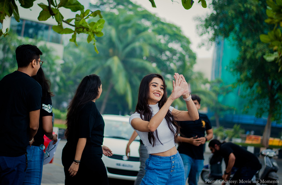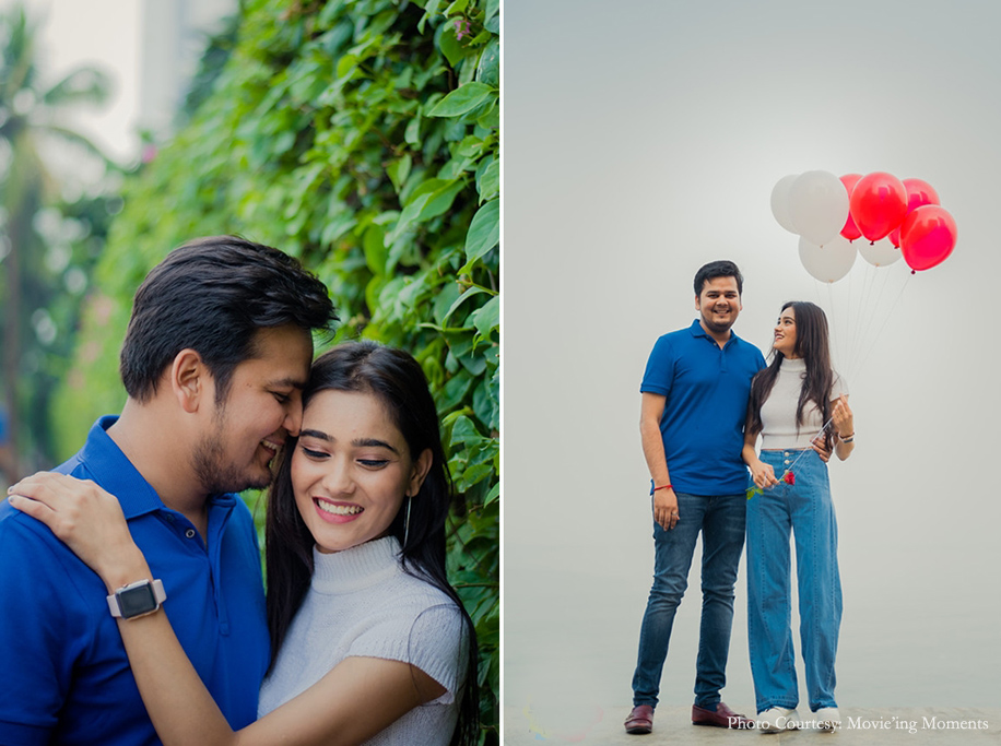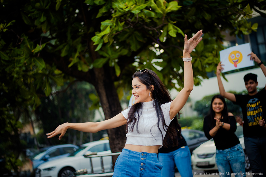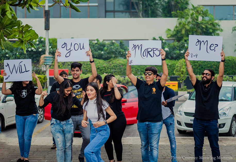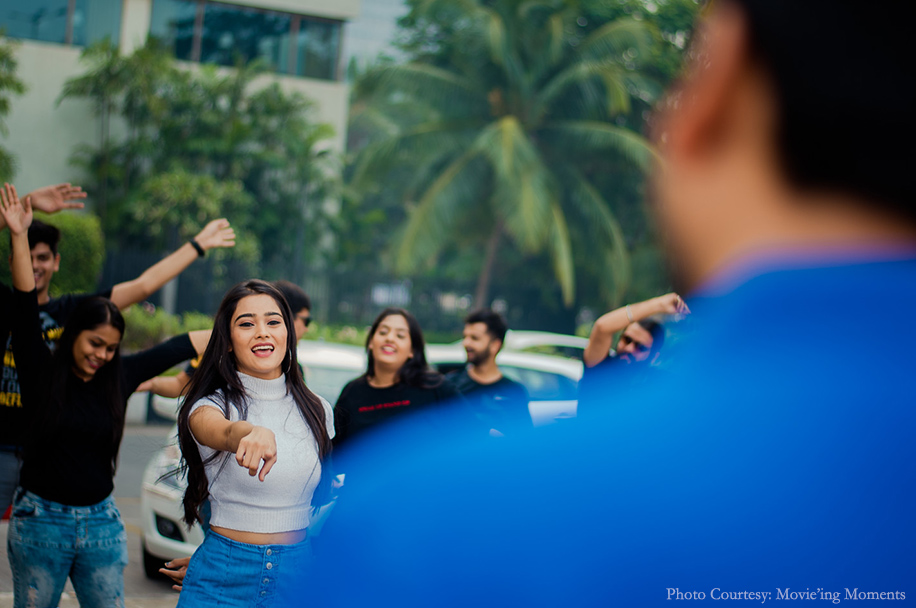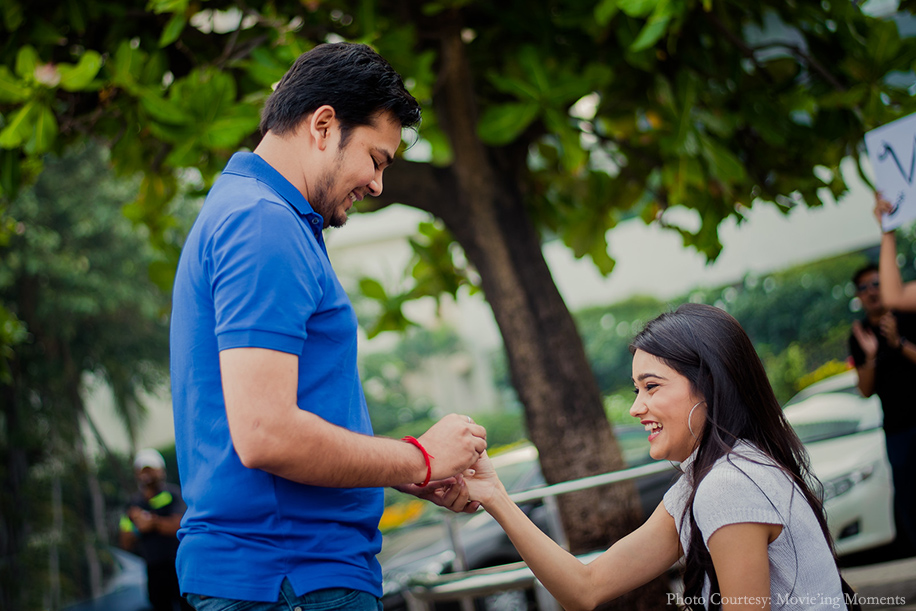 The talented team of Movie’ing Moments shares, “She asked Kartik out for breakfast one morning and they went to the Trident Hotel at Nariman Point. She was little skeptical about whether he’d be on time as he is not an early riser. But thankfully he managed to step out early and together they reached Nariman Point where Priyanka and Kartik’s friends were already waiting for them. The moment they both reached, a boy went to Kartik and handed over a bunch of red roses and after a few minutes, some colorful balloons. By the time Kartik could figure out what was happening, Priyanka and her friends broke out into a flash mob in front of Kartik. It was a sweet three-minute medley, well choreographed after which their friends held up the placards that read ‘Will you marry me?’ and then Priyanka went down on her knees as she proposed to Kartik with a red rose and a ring.