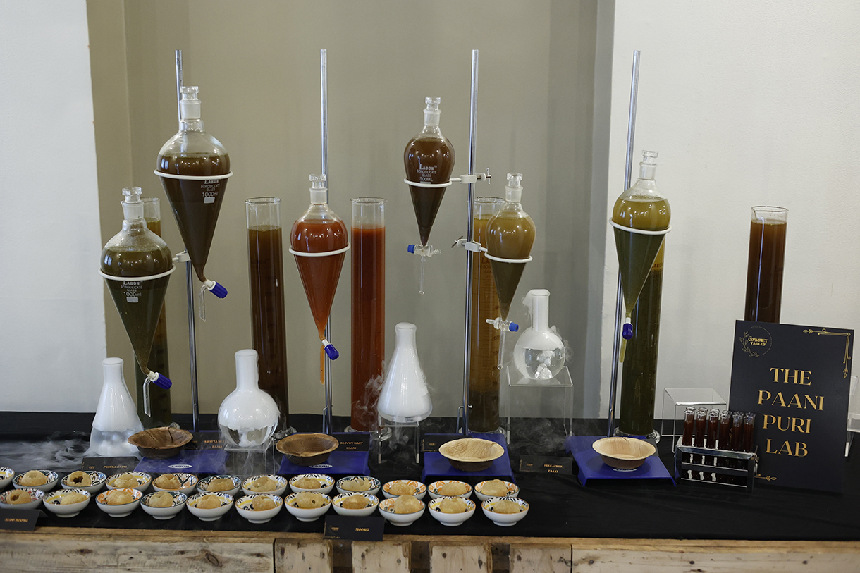 For a playful spin on nostalgia, The Gourmet Kitchen & Studio presents the Chaat Grazing Table. Seen recently at Victoria South, Mumbai, this lively setup reimagines Indian street food into an interactive format. Guests build their own chaats at DIY stations, sip pani puri shots from pipettes, and indulge in beautifully styled bhel jars. Combining familiar flavours with modern styling, it’s a perfect choice for couples looking to add vibrance and conversation to their celebrations.