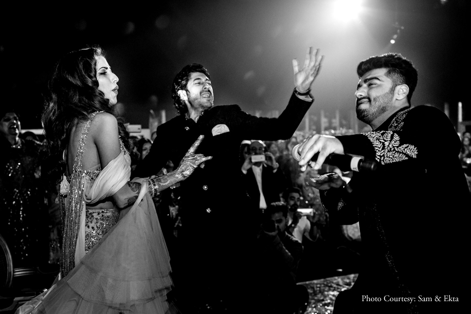 Arjun Kapoor entertains the gathering by shaking a leg with the couple.