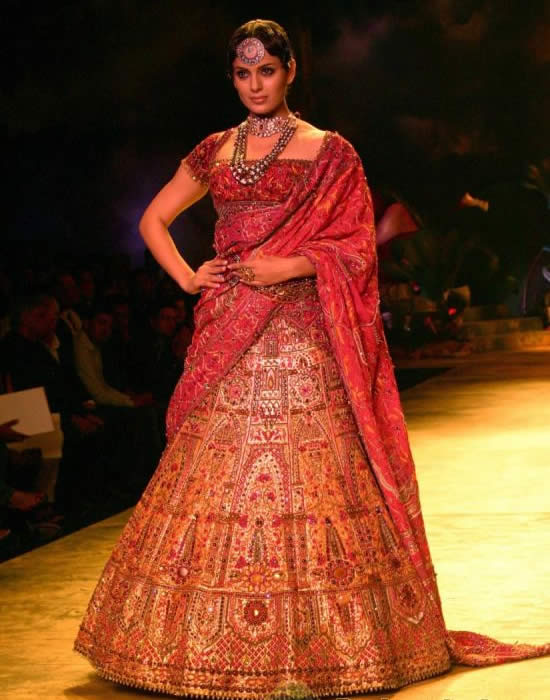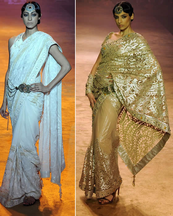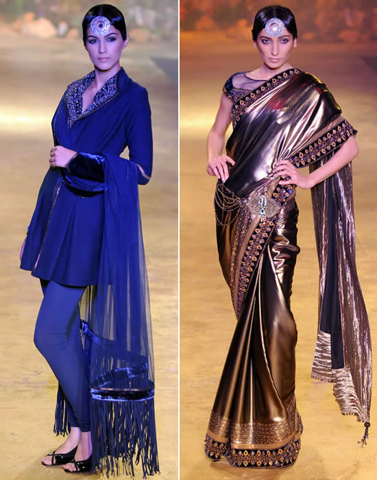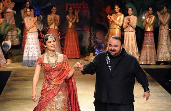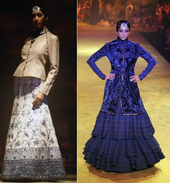 Inspired by a fictional character ‘Alika’, Valaya’s line at Delhi Couture Week had elegant saris, lehengas paired with sexy cholis and long jackets, short kurtas with skin-fit chudidars and achakans and angrakhas for men. Valaya also introduced ‘Alika’ jackets – a cross between a jacket and a shirt, kind of inspired by the traditional Garhwali garment “Sadri”. Kangana Ranaut who walked the runway in an exquisite bridal ensemble couldn’t stop gushing about the clothes.