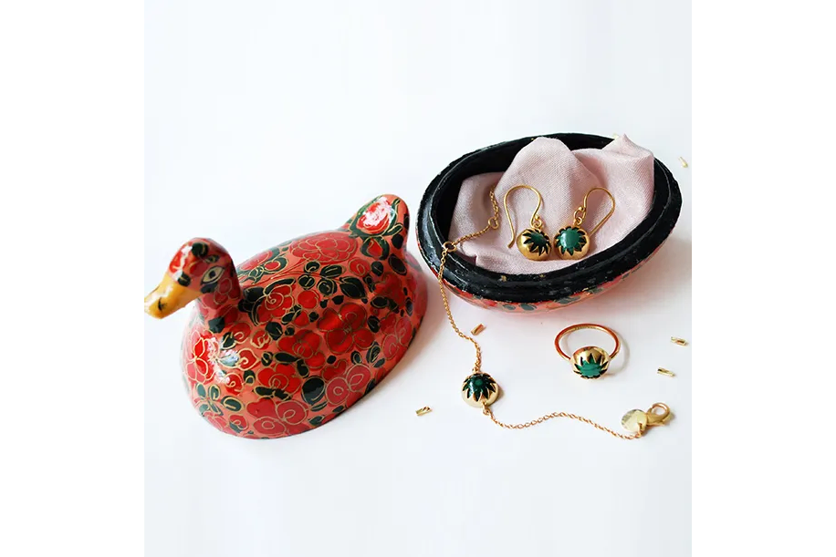 This 18k gold-plated Bijou jewelry set, delicately handcrafted with semi-precious gemstones, makes for a coveted Valentine’s Day gift!