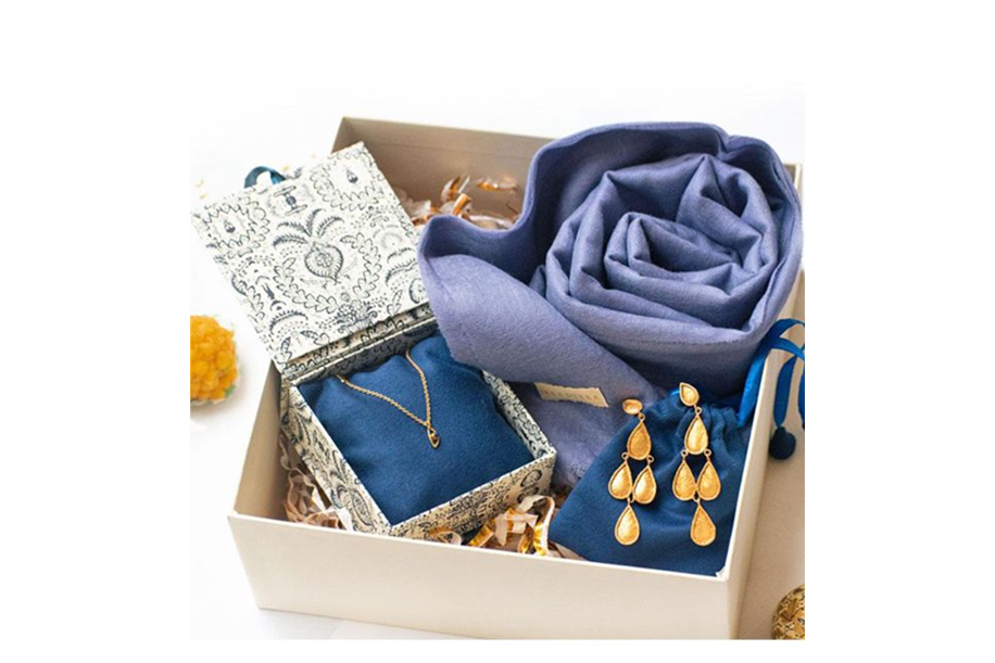 Opulent yet tasteful, this gift box is perfect for the one who loves the finer things in life. Consisting of a fine wool scarf, earring, and a lapis lazuli pendant this gift is bound to make her fall in love with you all over again!