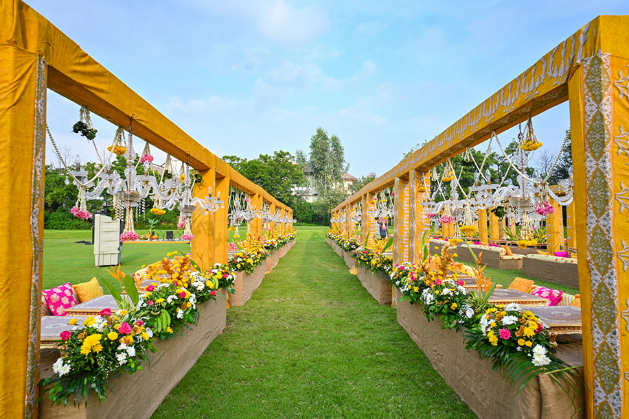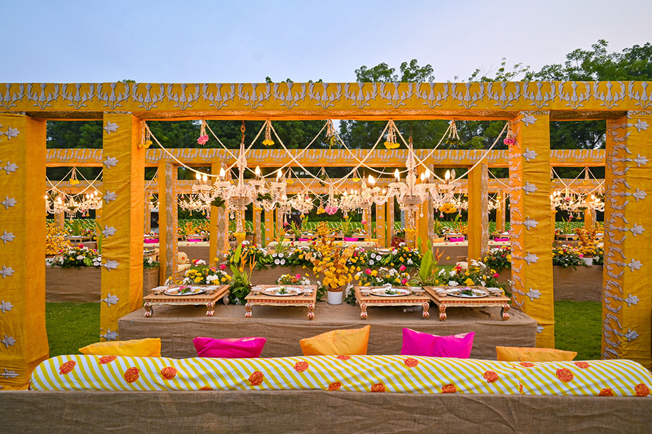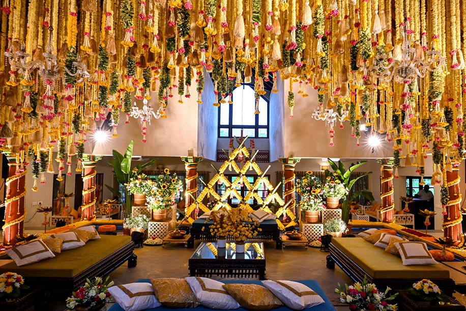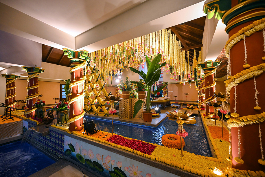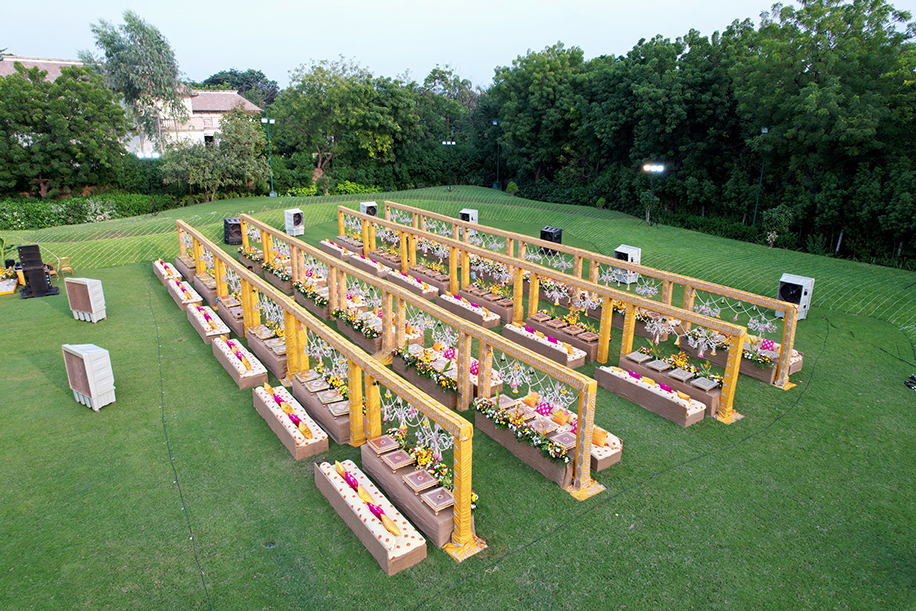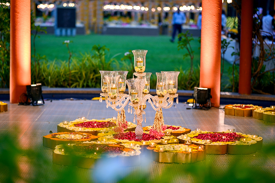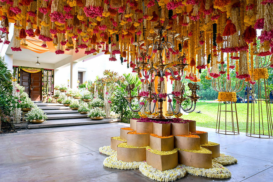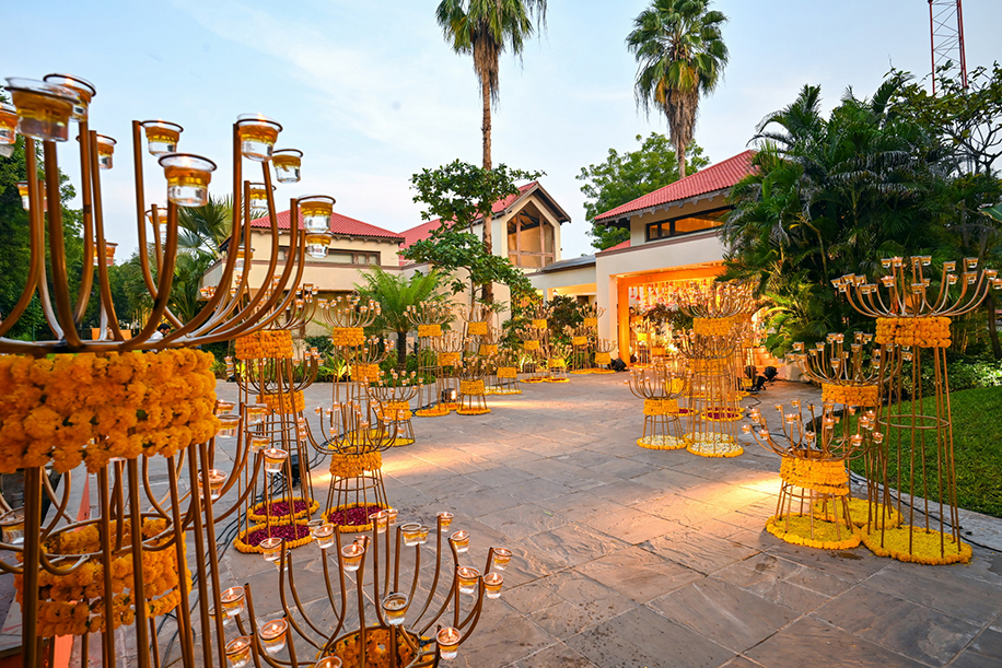 With a white and yellow colour palette that carried tinges of pink, the decor looked traditional with a hint of modern flamboyance. Giving us an overview of how the decor team bought this vision to life, Purva shares, “The design carefully curated the theme in a way that seamlessly fit with the surroundings. It was a complete traditional decor around marigolds, vintage-style props, larger-than-life setups, traditional-style diyas and floral rangoli. The use of old-style candelabras, banana leaves, elephant props, floral tassels, beautiful urlis and traditional-style seating gave it such a warm look. Chandeliers and floral arrangements made the dining experience one-of-a-kind.”