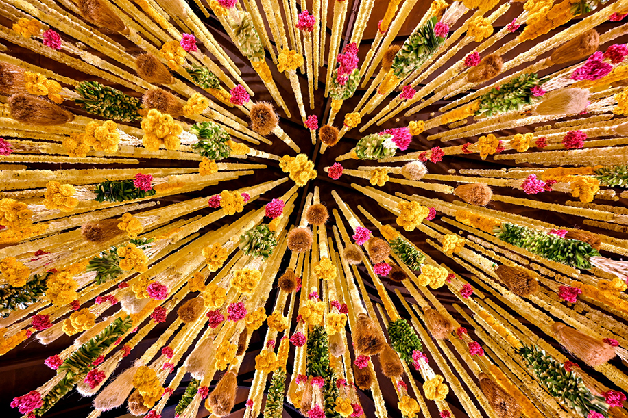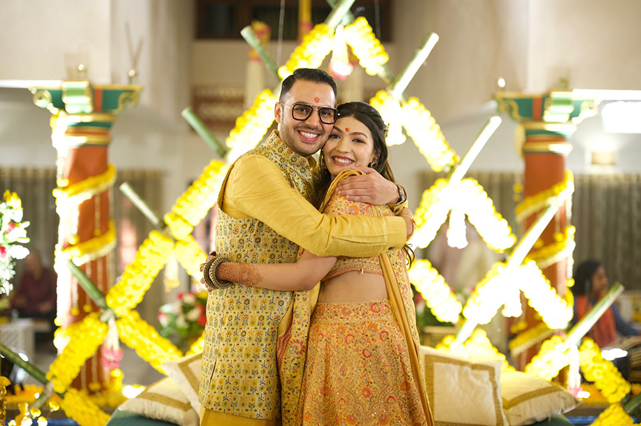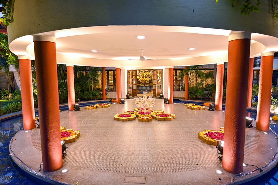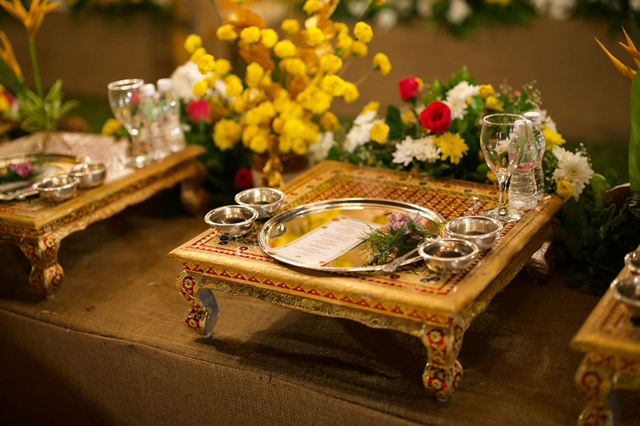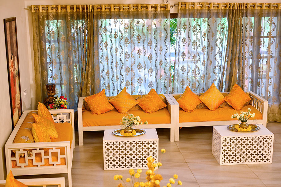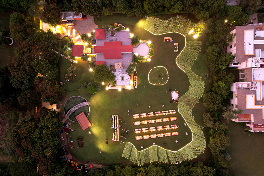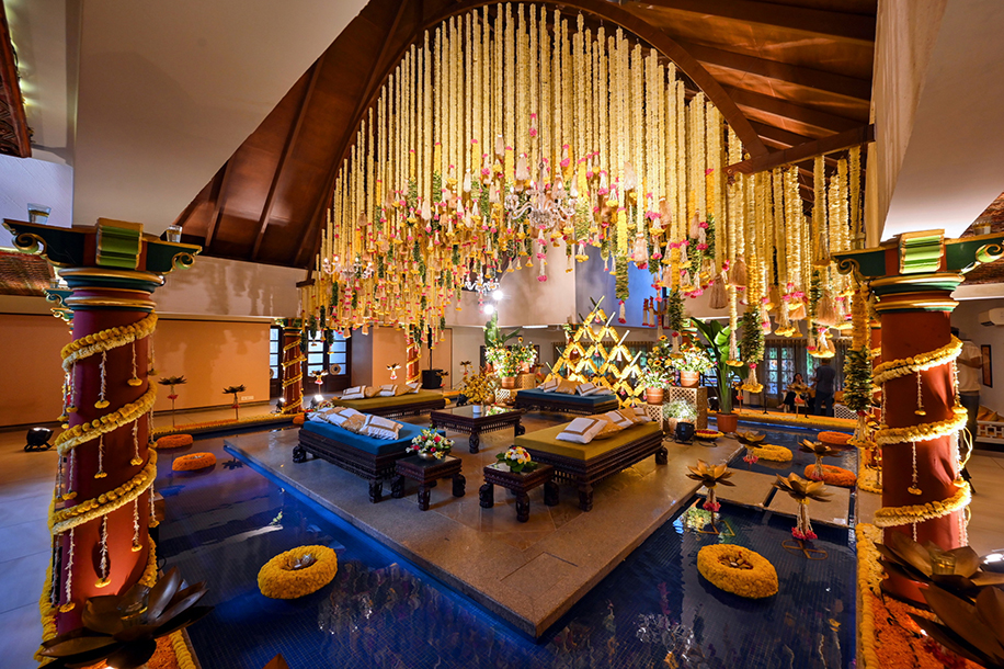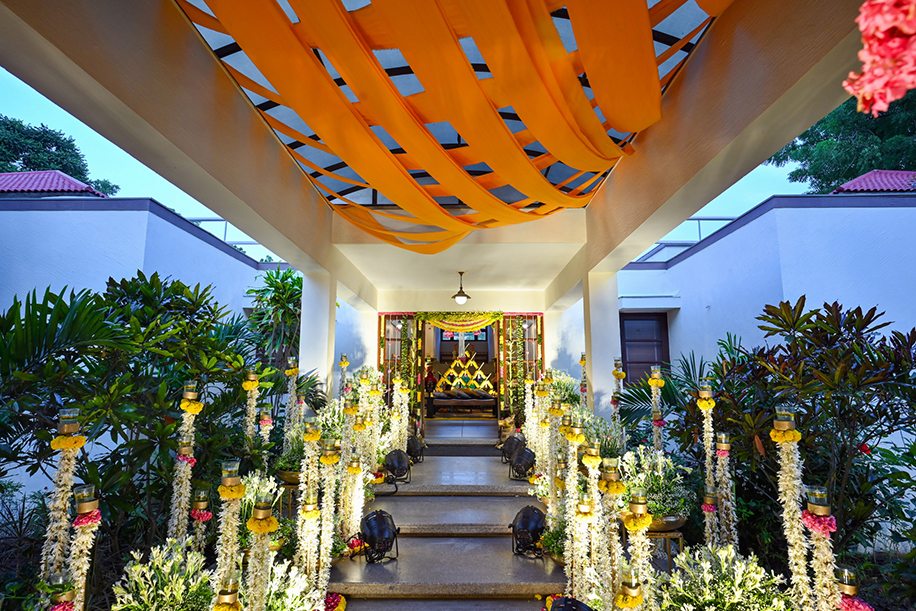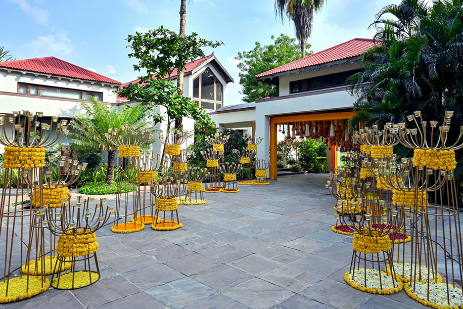 With a white and yellow colour palette that carried tinges of pink, the decor looked traditional with a hint of modern flamboyance. Giving us an overview of how the decor team bought this vision to life, Purva shares, “The design carefully curated the theme in a way that seamlessly fit with the surroundings. It was a complete traditional decor around marigolds, vintage-style props, larger-than-life setups, traditional-style diyas and floral rangoli. The use of old-style candelabras, banana leaves, elephant props, floral tassels, beautiful urlis and traditional-style seating gave it such a warm look. Chandeliers and floral arrangements made the dining experience one-of-a-kind.”
