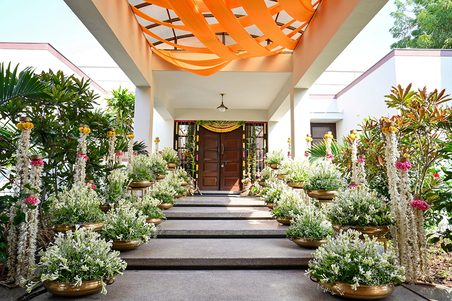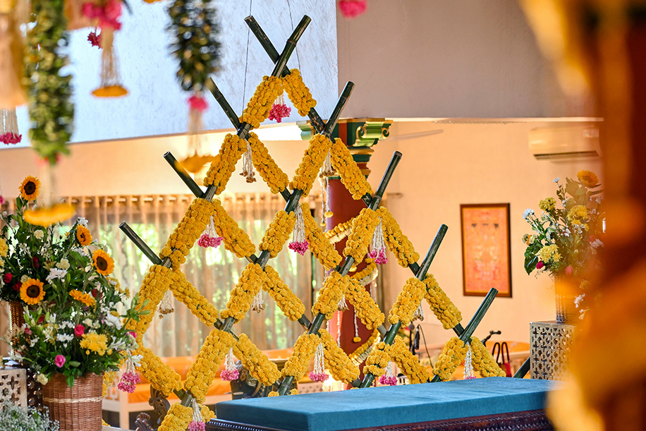 However, orchestrating a decor was not without its challenges as the team had to adapt to the landscape and ensure that everything looked absolutely flawless. Purva shares, “The home’s courtyard area where the engagement ceremony was to be held presented a challenge for us. We had ideated on a decor theme where floral tassels would hang from a canopy but due to the waterbody around the area, we couldn’t use a truss structure! Plus, we also wanted to hang the tassels in an arch format to complement the venue’s architecture. In short, it was a battle between creativity and logistics where we struggled to find a middle ground. Finally, the team brainstormed and created a wire mesh from the existing structure and hung all the floral tassels in an arch format, which was quite a challenging task!”